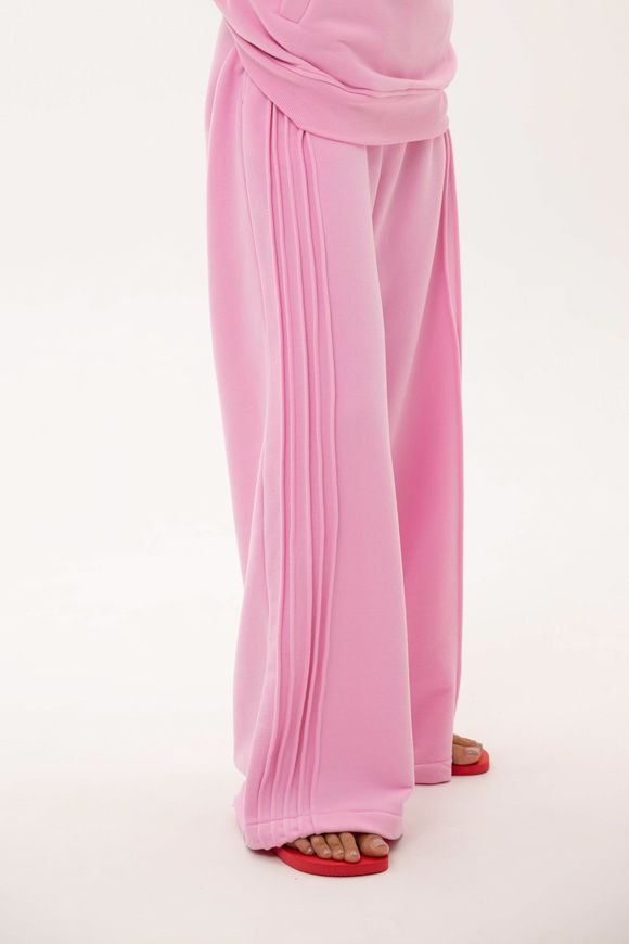 Spodnie WIDE z szeroką nogawką i charakterystycznymi przeszyciami. Spodnie wide zostały wykonane z mięsistej dzianiny diagonalnej o charakterystycznym skośnym splocie, gramatura to 320g, dodatkowo z uszlachetnieniem skin peach (w dotyku przypomina delikatną skórkę brzoskwini) są miękkie i niesamowicie przyjemne dla skóry. Bardzo wygodna, szeroka guma w pasie z sznurkami, którymi możesz regulować szerokość.
