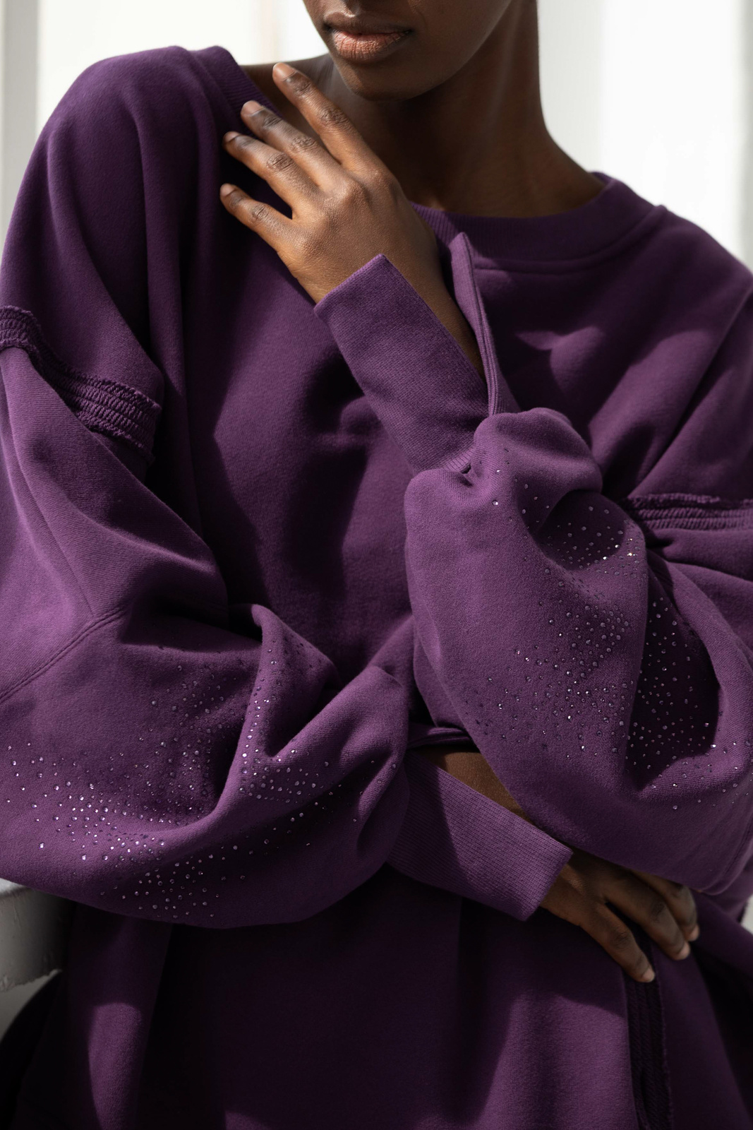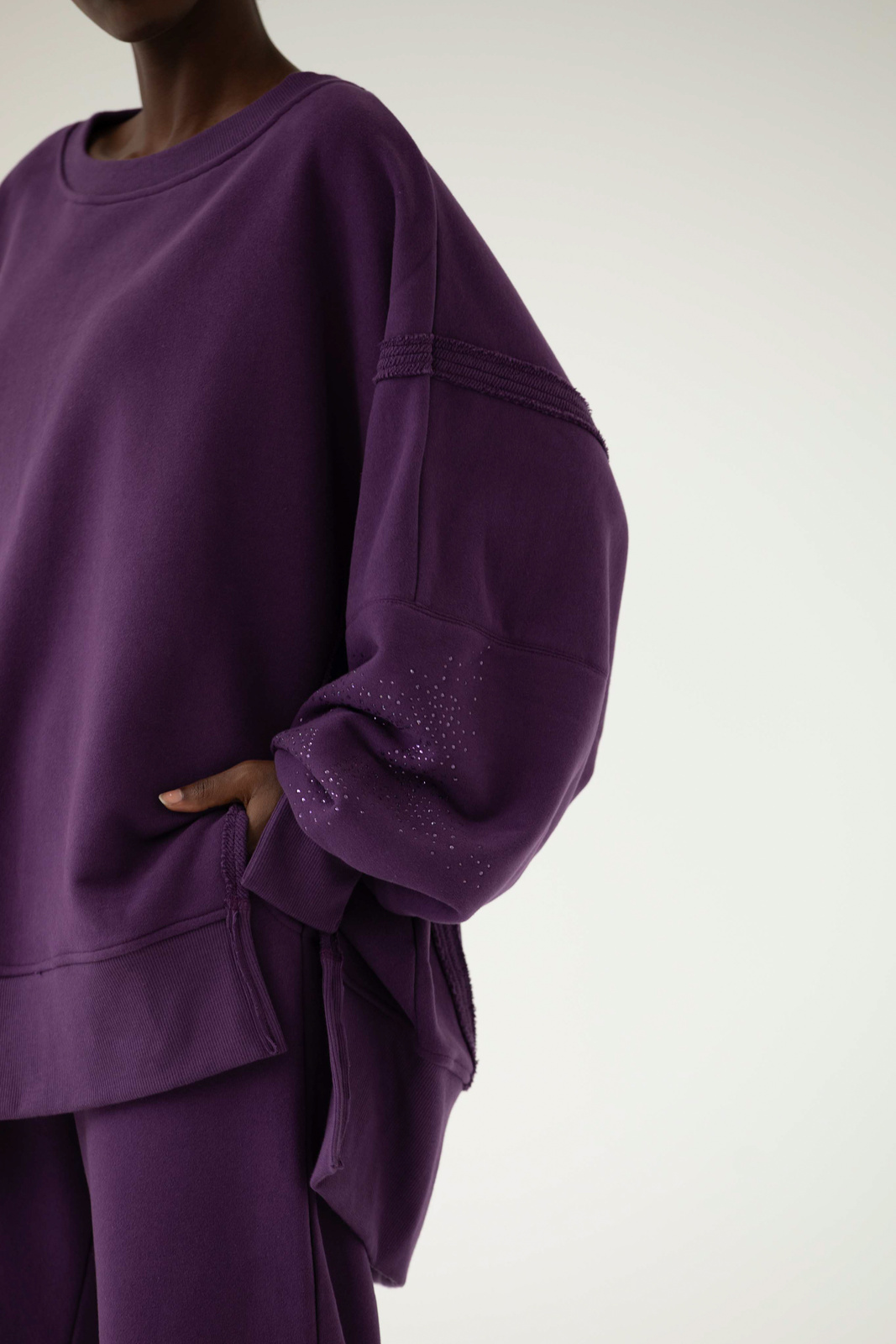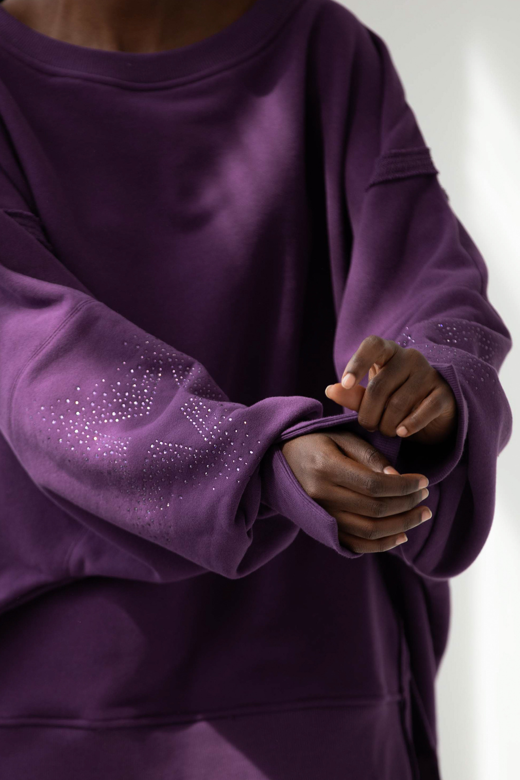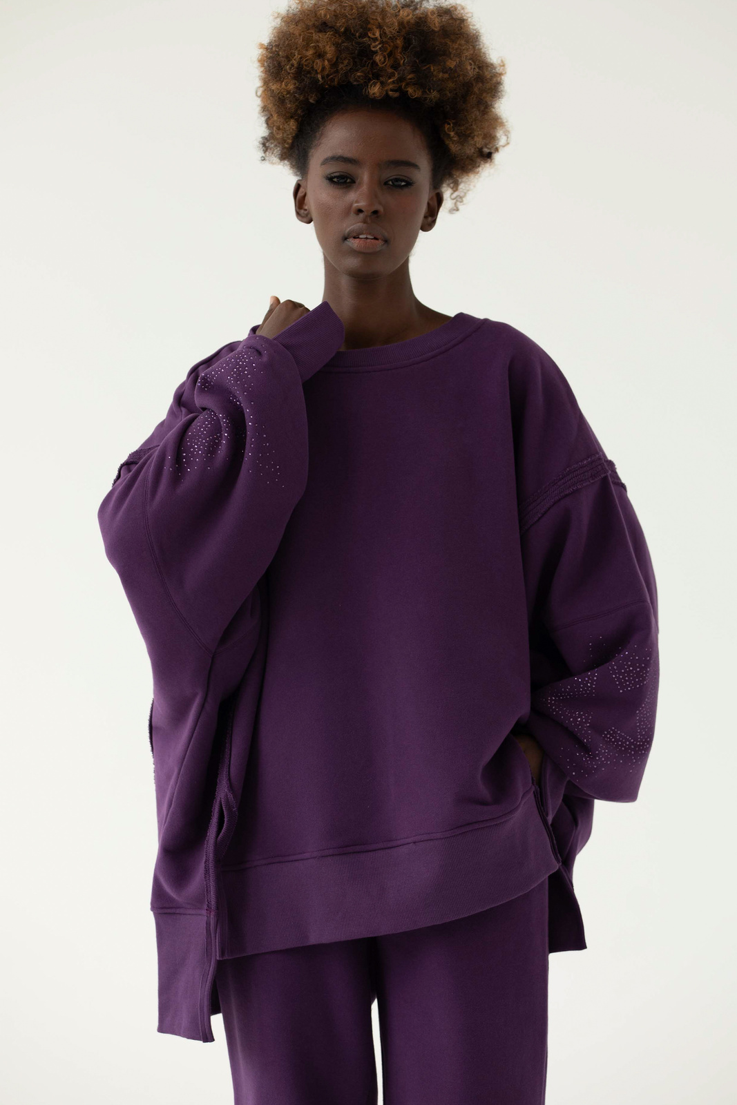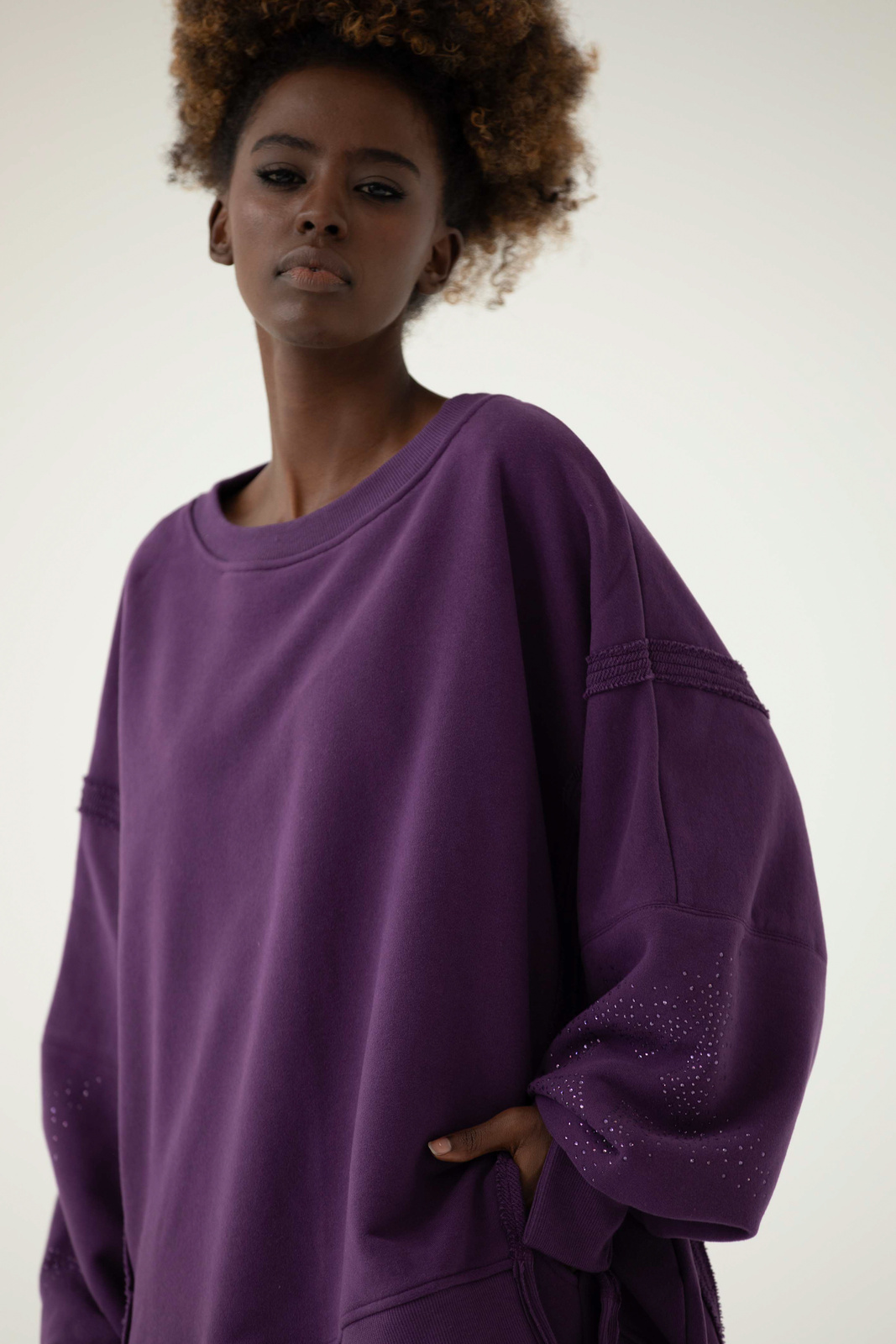 OFF to nasz flagowy model z charakterystycznymi przeszyciami oraz pęknięciami na rękawach. OFF allstars została uszyta z mięsistej dzianiny pętelkowej diagonal, gramatura 320 g, dodatkowo z uszlachetnieniem skin peach oraz ponownym zmiękaczniem, w dotyku przypomina delikatną skórkę brzoskwini. Oprócz tego, że jest mięsista to również niesamowicie miękka i przyjemna dla skóry. Fason oversize, bardzo wygodna i charakterystyczna forma z wydłużonym tyłem. Aplikacje na rękawach, dwie duże gwiazdy wykonane z błyszczących kryształków w kolorze dzianiny. Legenda głosi, że nasza OFF uzależnia i na jednej się nie kończy :) Świetnie wygląda w połączeniu z dedykowanymi joggerami LOOM w tym samym kolorze lub z czarnymi leginsami jeansami.