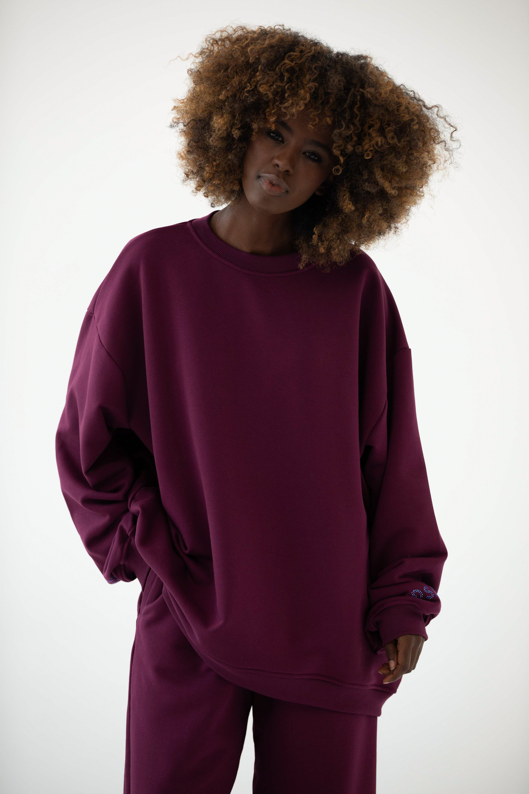 Głębia koloru grape wine od razu robi efekt wow.. to ten odcień, który wygląda obłędnie zarówno w codziennym looku, jak i w totalnie casualowych stylówkach. Do tego oversize’owy krój i ten cool vibe. Dziania z wykończeniem diagonalnym czyli ta skośna ładna pętelka. Materiał ma konkretną gramaturę bo aż 385 g, jest mięsisty, trzyma kształt, ale dzięki dodatkowemu zmiękczeniu pozostaje superprzyjemny w dotyku. Na rękawach znajdziesz subtelny akcent, błyszczące logo, które dodają jej charakteru, ale nie odbierają minimalizmu.