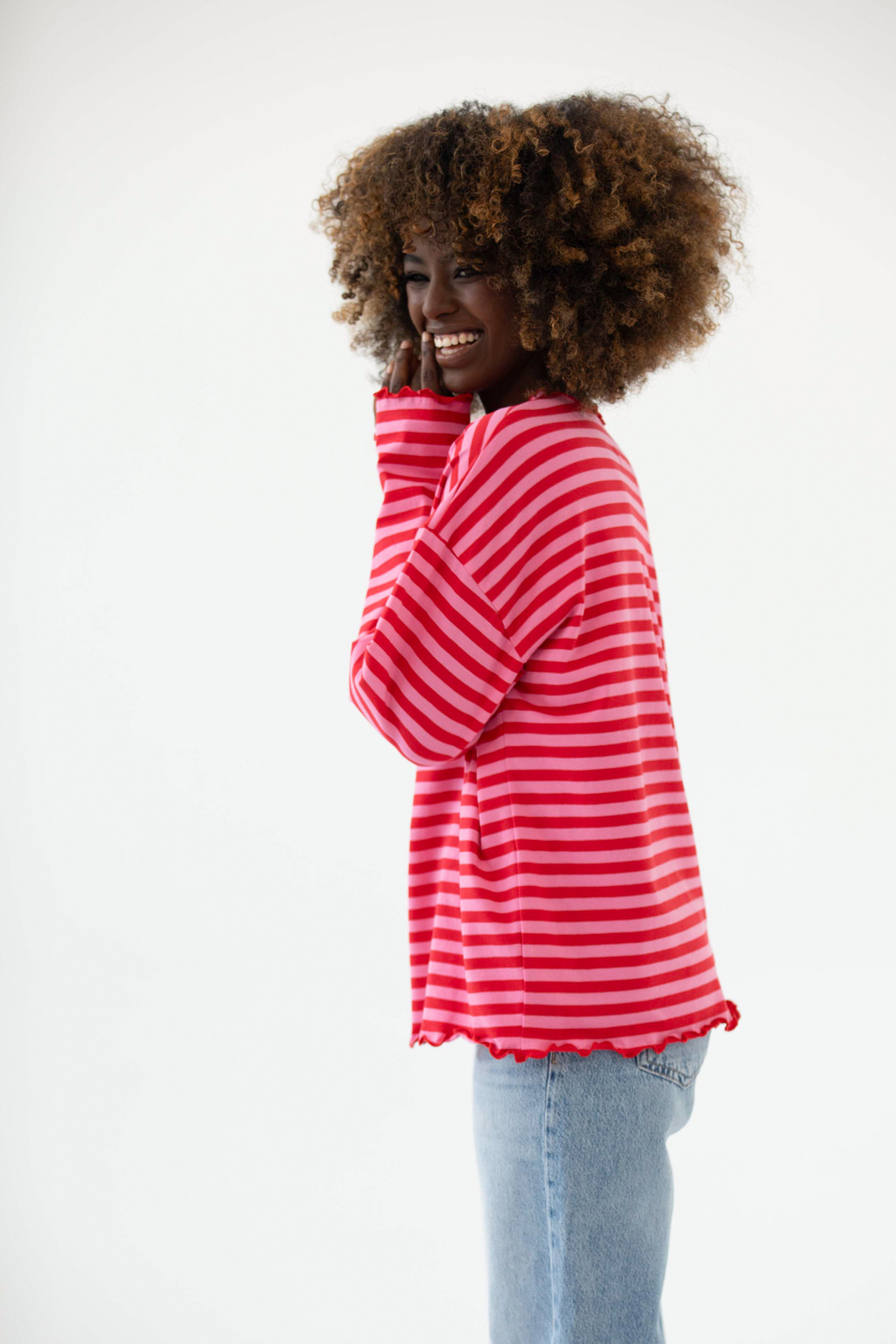 Klasyk, ale w naszej wersji, LONGSLEEVE SHAKE REDDISH PINK to oversize’owy longsleeve w paski, który od razu dodaje energii. Połączenie czerwieni i różu robi robotę jest świeżo, odważnie i totalnie w klimacie shake’a owocowego. Ma lekko obniżoną linię ramion i wykończenie typu „lettuce hem” na dole oraz rękawach dzięki temu całość wygląda luźno i dziewczęco, ale bez przesłodzenia. Idealny do jeansów, spodni dresowych czy pod marynarkę, kiedy chcesz wnieść trochę koloru do dnia. Zrobiliśmy go z mieszanki 92% bawełny i 8% elastanu, więc jest miękki, oddychający, a przy tym lekko sprężysty, nie krępuje ruchów i zawsze układa się tak, jak chcesz.