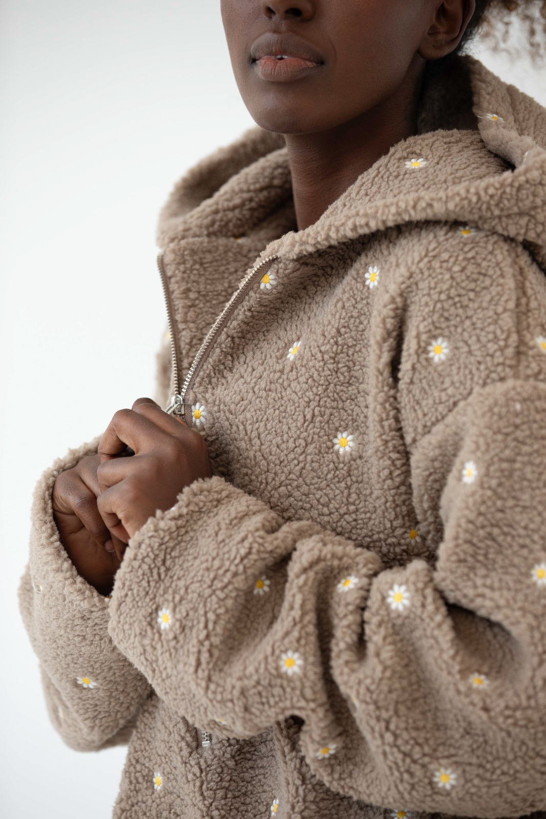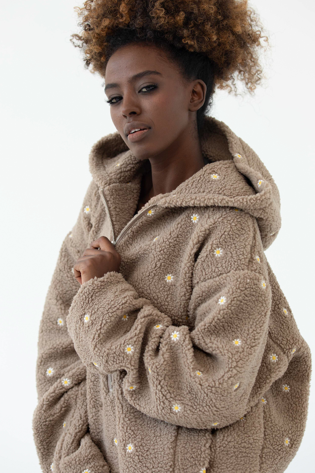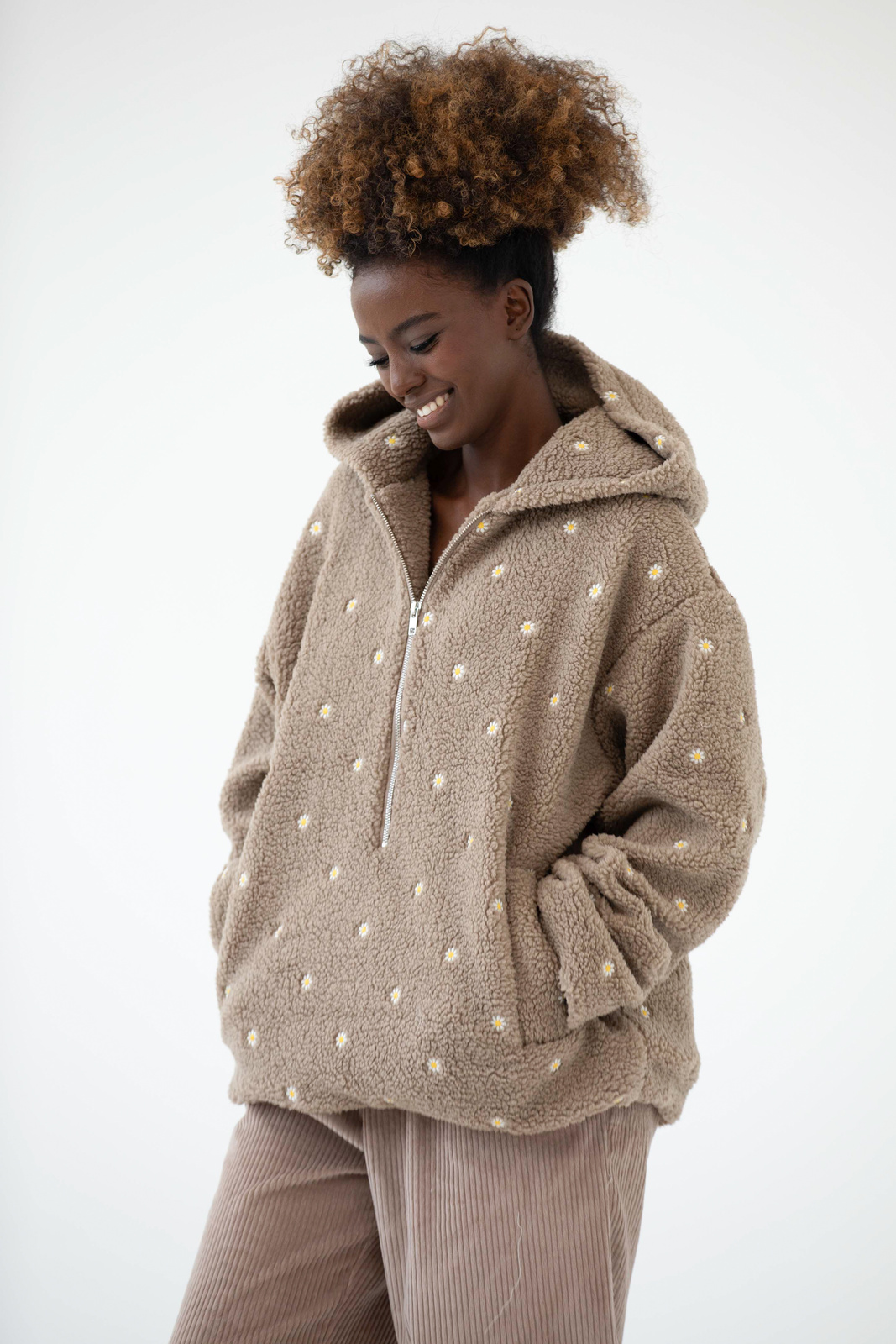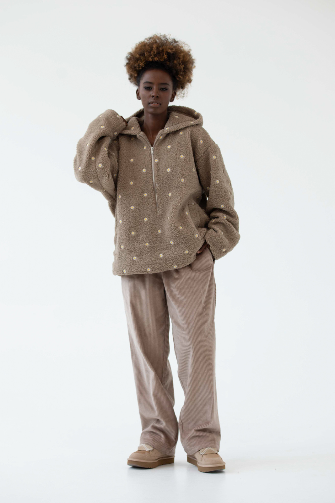 Miękki, oversize’owy pullover, który wygląda jak przytulny kocyk, ale w wersji premium. Uszyty z puszystego teddy w kolorze ciepłego brązu, a do tego cały w stokrotki bo kto powiedział, że wygoda nie może być słodka? Luźny krój, duży kaptur i półsuwak z przodu sprawiają, że możesz nosić go jak chcesz, do jeansów, sztruksów albo naszych straight legów. Wkładasz i od razu robi się cozy vibes.