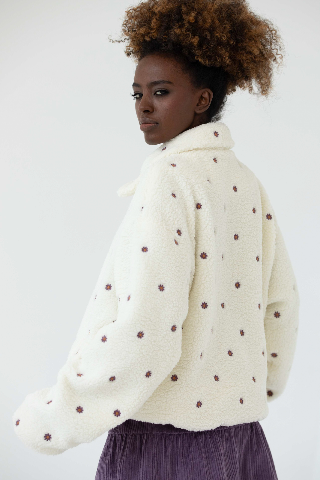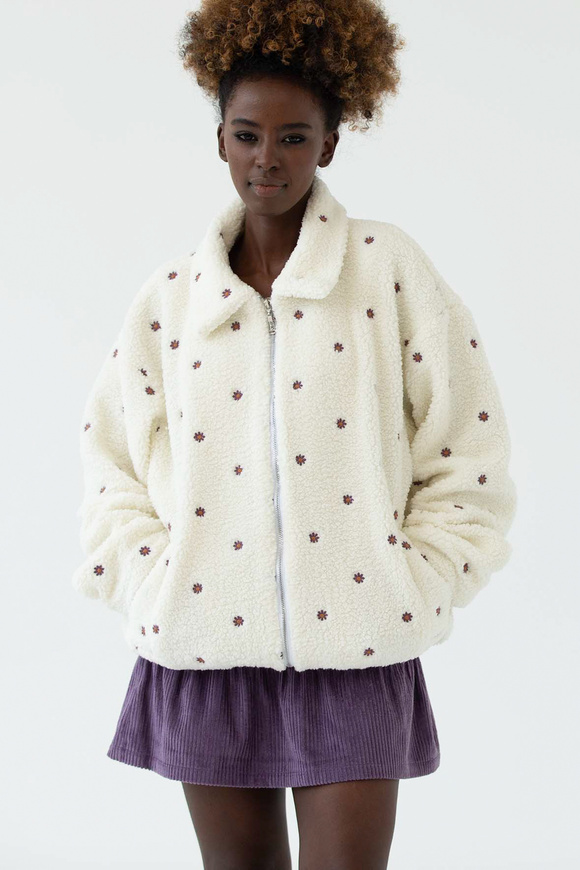 Ciepły, miękki i otulający Sugar Teddy Pullover to oversize’owa bluzo-kurtka zapinana na suwak, uszyta z przyjemnego w dotyku, pluszowego materiału. Jej kremowa baza ozdobiona została drobnym, fioletowym motywem kwiatowym, który dodaje jej subtelnej dziewczęcości. Klasyczny kołnierzyk i luźny krój sprawiają, że pullover świetnie prezentuje się zarówno w casualowych, jak i bardziej stylizowanych zestawach. Idealna na chłodniejsze dni, noś do ulubionych jeansów, spódnic czy legginsów, tworząc wygodne stylizacje.