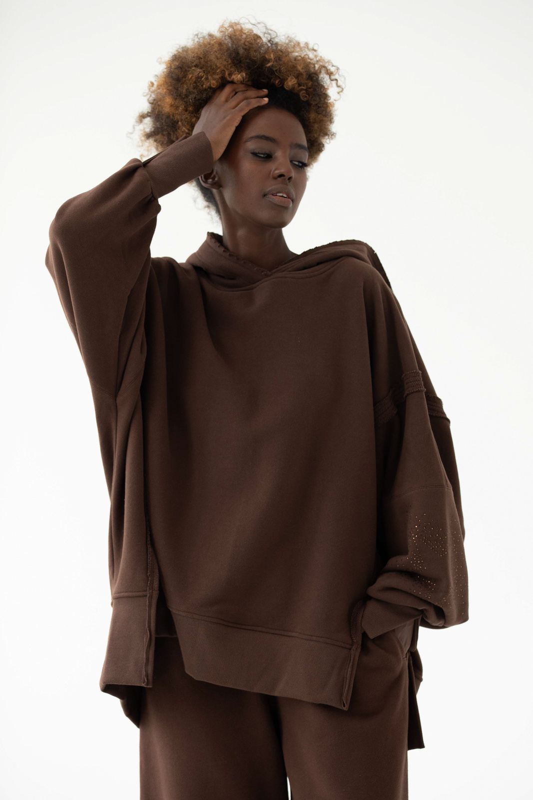 EVER to nasz flagowy model z charakterystycznymi przeszyciami, pęknięciami na rękawach oraz "pociętym" kapturem, który zaczyna wyglądać jeszcze lepiej z każdym kolejnym praniem. EVER allstars została uszyta z mięsistej dzianiny pętelkowej diagonal, gramatura 320 g, dodatkowo z uszlachetnieniem skin peach i ponownym zmiękczaniem w dotyku przypomina delikatną skórkę brzoskwini. Oprócz tego, że jest mięsista to również niesamowicie miękka i przyjemna dla skóry. Fason oversize, bardzo wygodna i charakterystyczna forma z wydłużonym tyłem. Aplikacja na kapturze i rękawie, dwie duże gwiazdy wykonane z czarnych błyszczących kryształków. Legenda głosi, że nasza EVER uzależnia i na jednej się nie kończy :) Świetnie wygląda w połączeniu z czarnymi leginsami  jeansami.