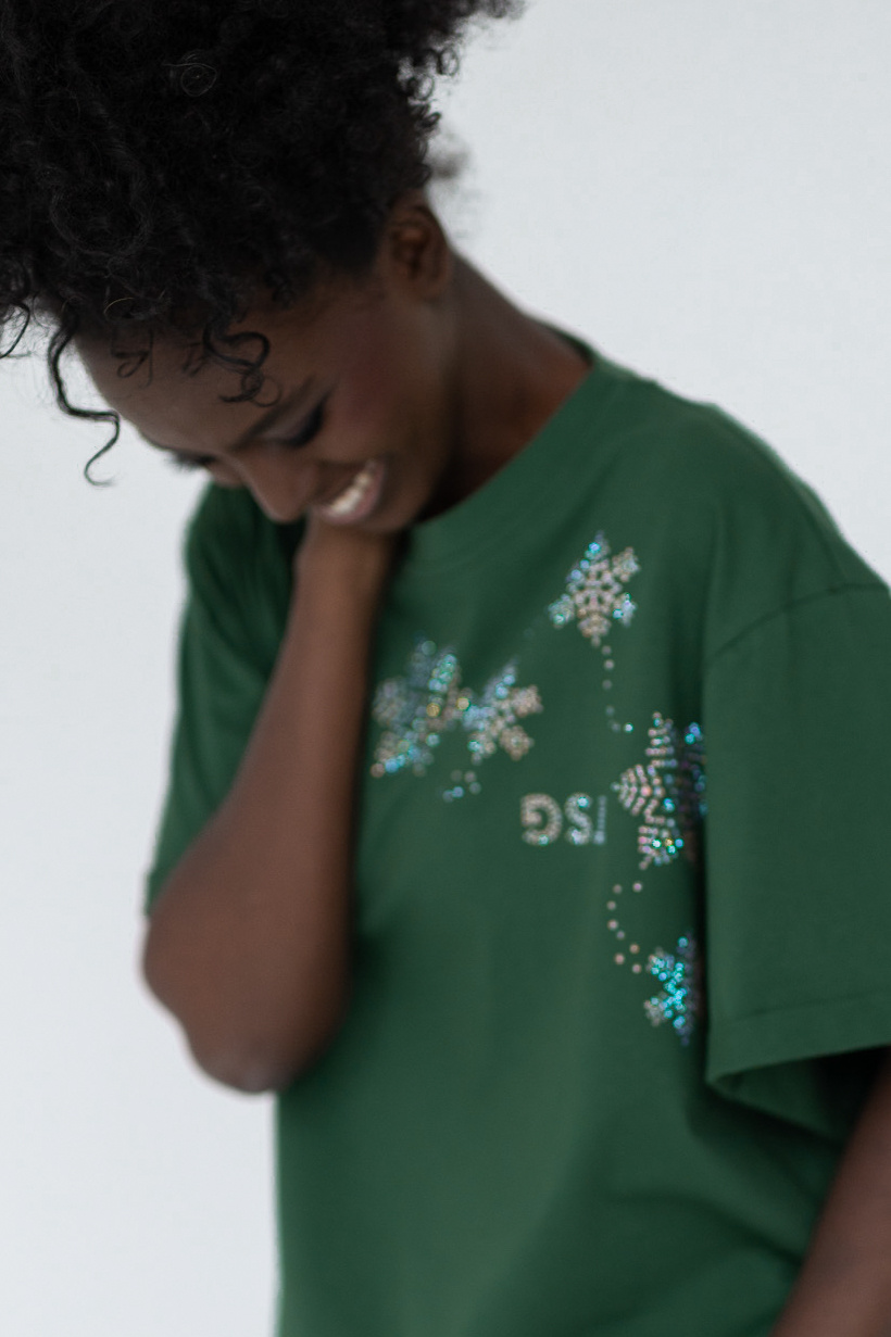 T-shirt Green Snowflakes to coś czego potrzebujesz, jeżeli lubisz ubrania z charakterem. Oversizowy, pudełkowy bardzo wygodny krój, a te detale? Aplikacja śnieżynek z kryształków, które błyszczą po prostu niesamowicie, na zdjęciach nie jest to łatwe do uchwycenia, ale w rzeczywistości jest efekt "wow" i wygląda to totalnie wyjątkowo! T-shirt uszyliśmy z 100% bawełny premium. Sprawdzi się w każdej streetwearowej stylizacji i doda charakteru, to po prostu must jeżeli lubisz łączyć luz z oryginalnością.