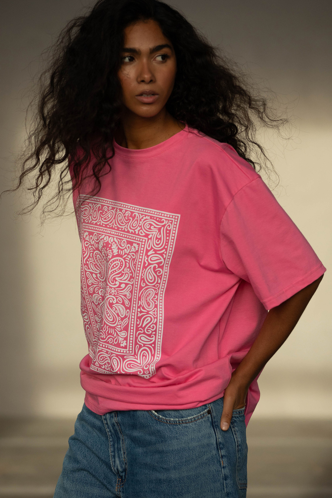 Na froncie duży biały print w stylu bandany dodaje streetowego luzu i lekko retro charakteru. Połączyliśmy go z różem dzianiny, żeby stworzyć kontrast, który wygląda świeżo, odważnie i totalnie nowocześnie. To model, który nie potrzebuje wielu dodatków on sam robi całą stylówkę.