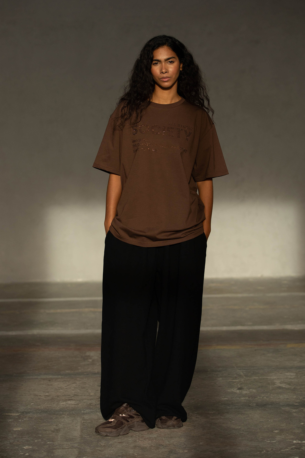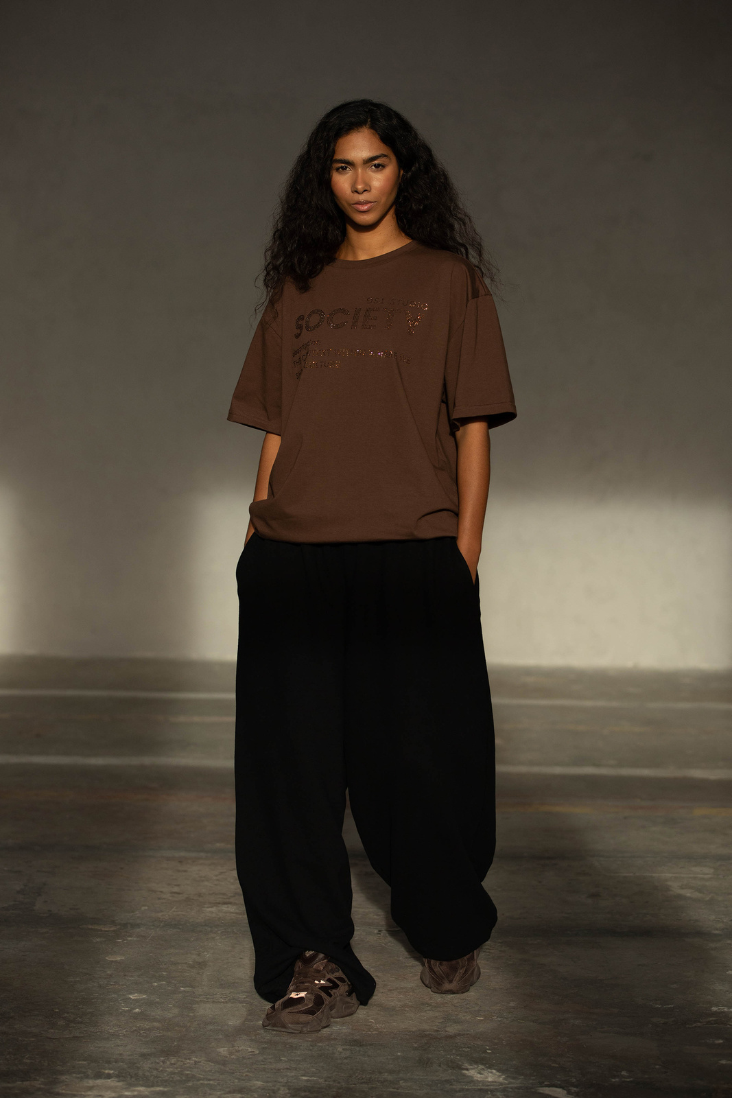 Czekoladowy odcień dzianiny i dopasowany kolorystycznie print SOCIETY z drobnych kryształków tworzą monochromatyczny look, który błyszczy delikatnie, ale zdecydowanie. Kryształki zostały wgrzane pod prasą, więc nie odpadają po praniu i zachowują swój blask nawet przy intensywnym noszeniu.
