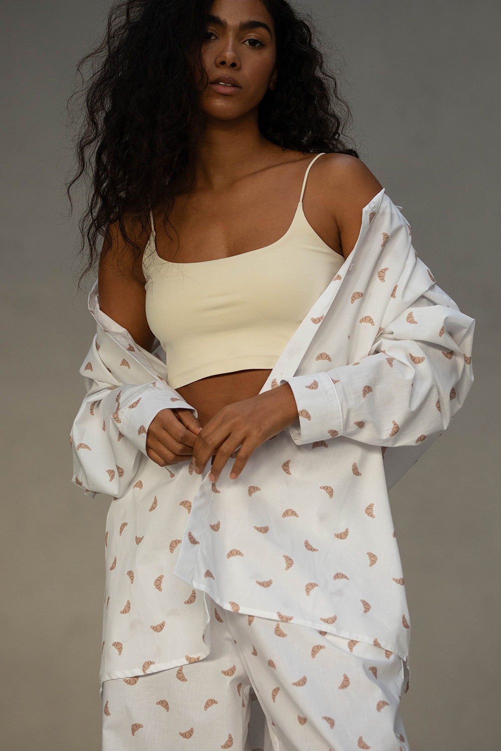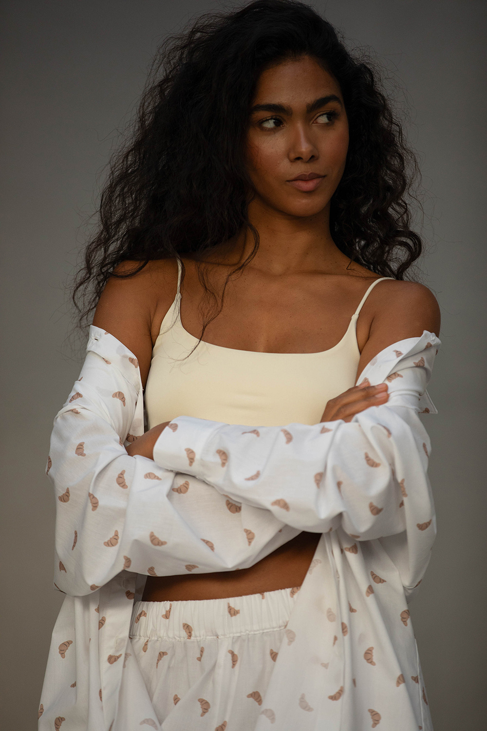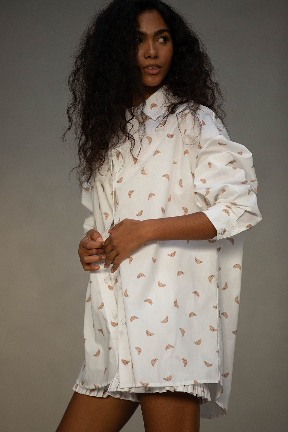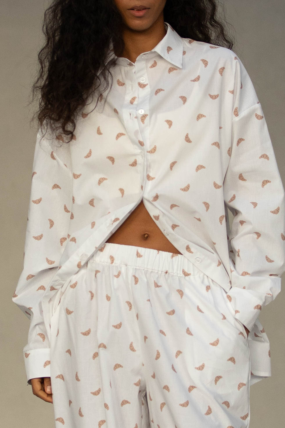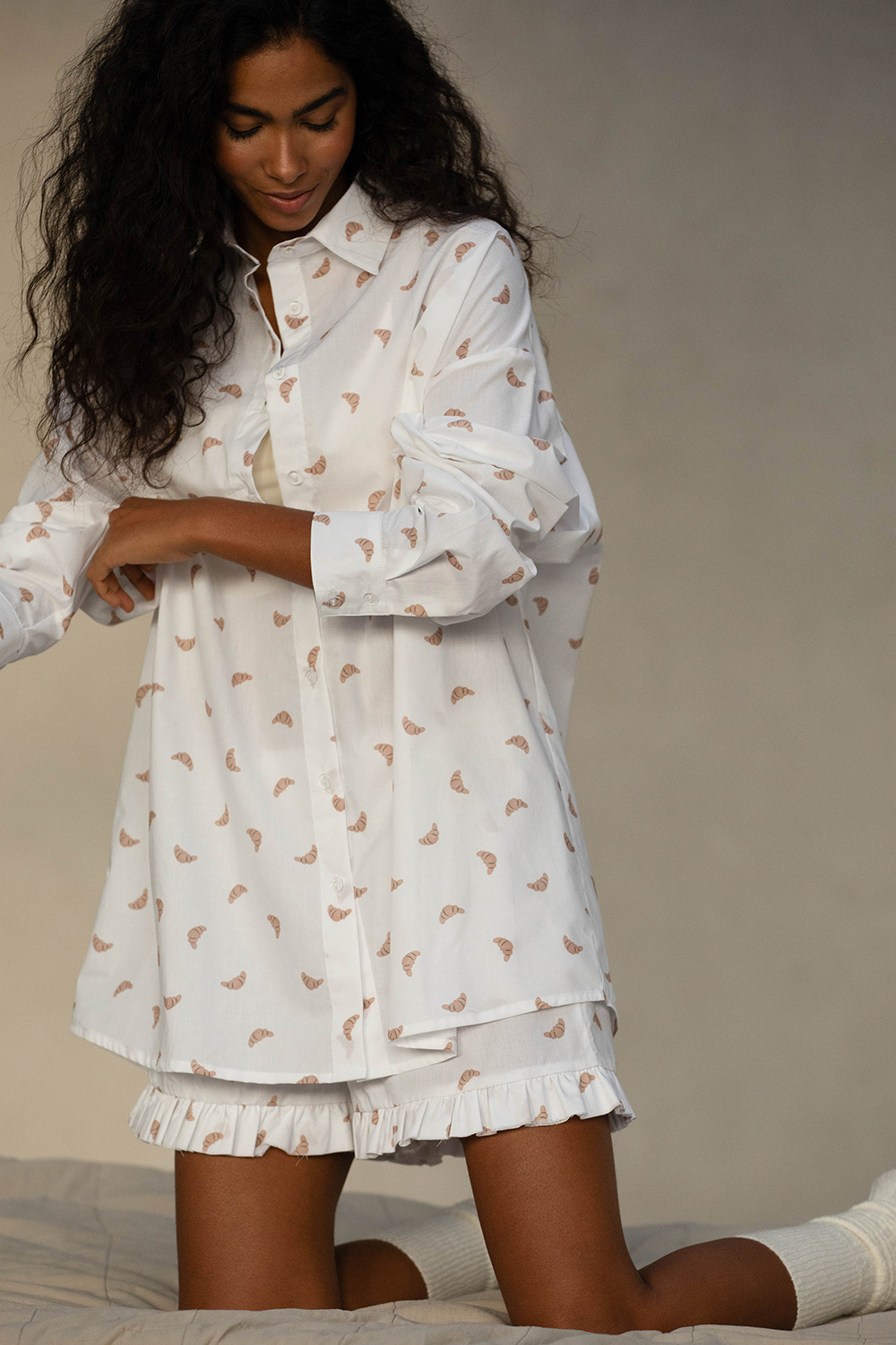 Oversize’owy krój, 100% miękkiej bawełny i wzór w subtelne croissanty. Możesz nosić ją jak lekką piżamową koszulę albo połączyć z jeansami i stworzyć luźny, miejski look. Jest przewiewna, wygodna i uniwersalna dokładnie taka, po którą sięga się najczęściej, bo sprawdza się o każdej porze dnia.