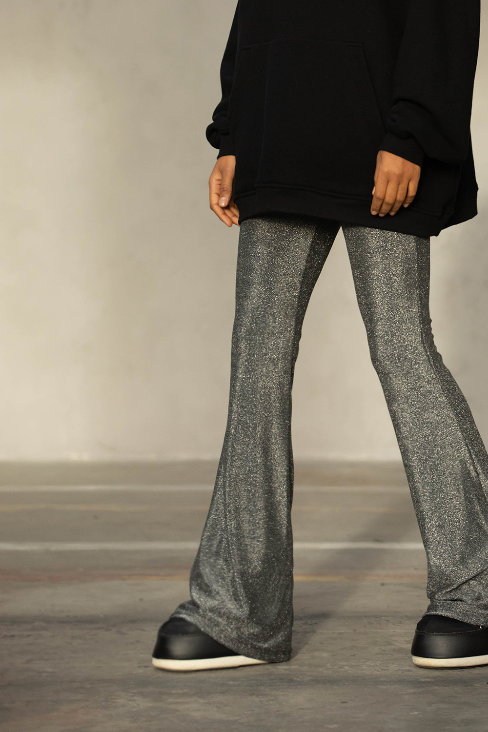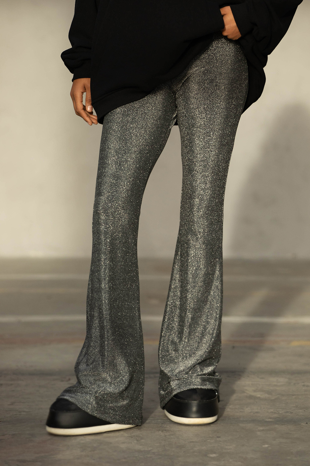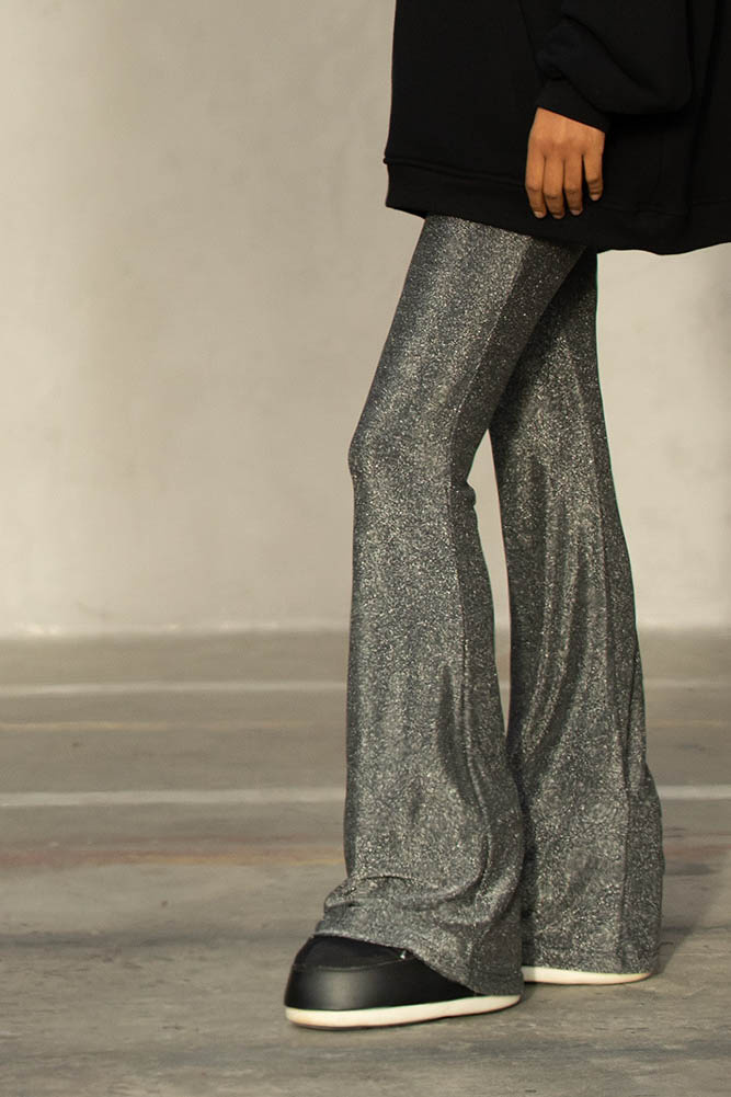 Spodnie Midnight to esencja wieczornego blasku zamknięta w wygodnej formie. Smukłe w udzie i rozszerzone na dole dzięki czemu optycznie wydłużają sylwetkę. Połyskujący materiał odbija światło przy każdym ruchu. Mimo eleganckiego glow noszą się jak miękkie elastyczne leginsy to model, który pracuje z sylwetką.