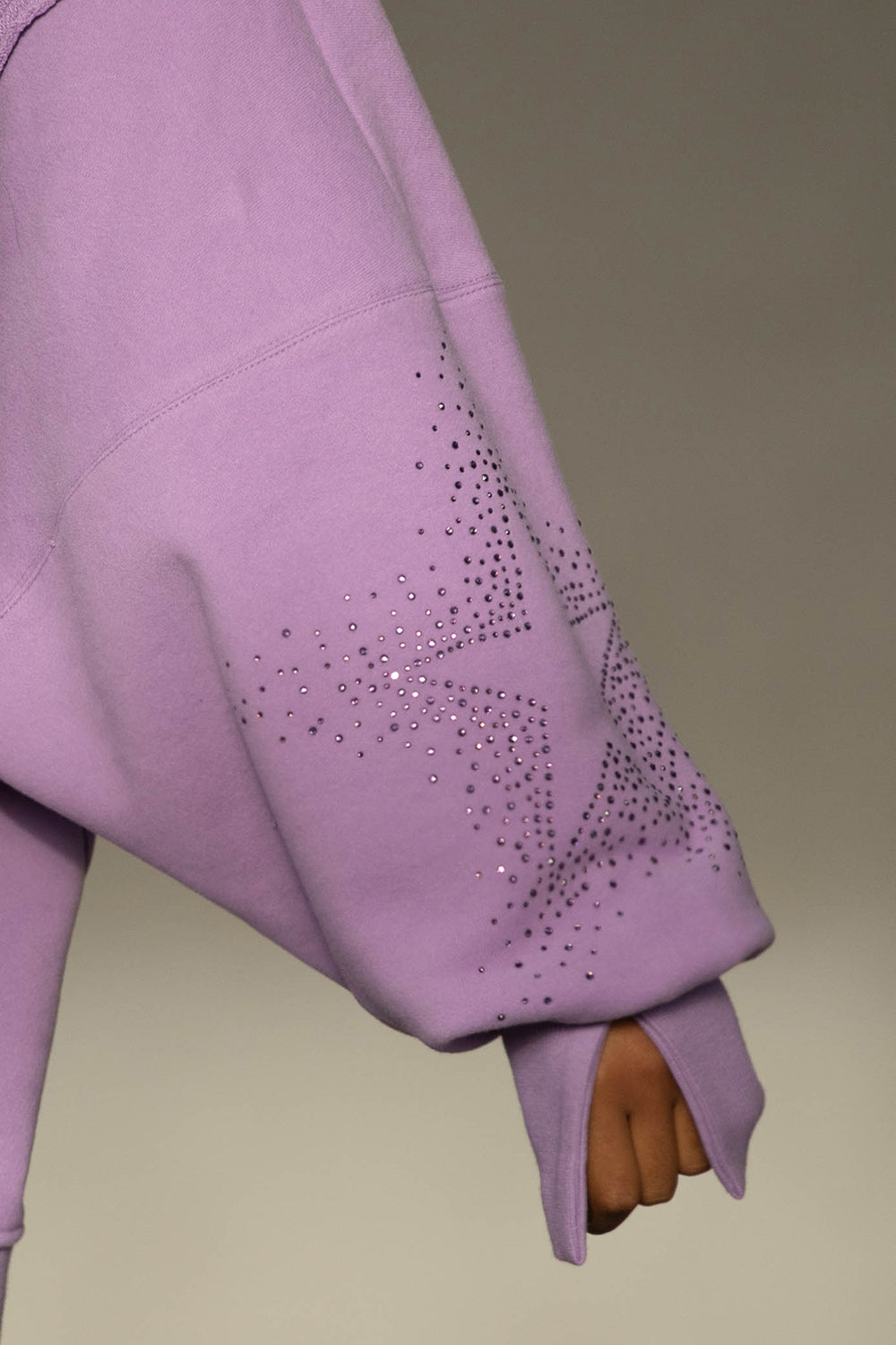Oversize, charakter I wygoda wszystko w jednym. Ta bluza to styl w czystej formie. Surowy, lekko postrzępiony brzeg przy kapturze nadaje jej charakteru, to celowy zabieg konstrukcyjny, który sprawia, że kaptur wygląda bardziej „żywo”, mniej grzecznie, bardziej streetowa. Na rękawach i przy bokach znajdziesz ozdobne przeszycia, które przełamują gładkość dzianiny i dodają formie surowej architektury. Nie jest to zwykła bluza, to projekt ze świadomie odsłoniętymi elementami konstrukcji. Duży i obszerny, miękko opadający kaptur, surowo wycięta krawędź daje mu mocny, streetwearowy vibe, a gwiazdy jedna na rękawie i druga na kapturze wykonane z kryształków robią niesamowity efekt, kryształki dobieramy pod kolor dzianiny, aby stworzyć monochromatyczny efekt. Mocny oversize z wydłużonym tyłem, szerokimi rękawami i obniżoną linią ramion. Surowa, miejska, nowoczesna.