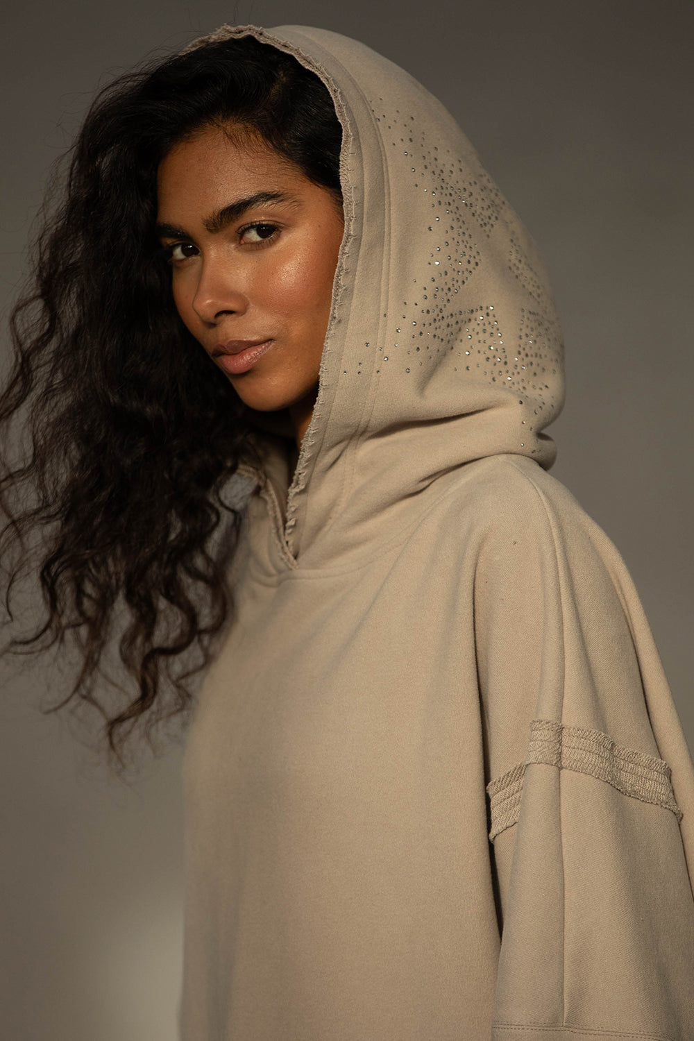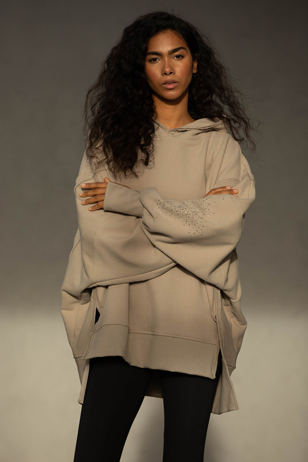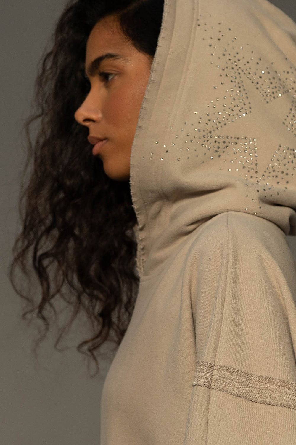 Oversize, charakter I wygoda wszystko w jednym. Ta bluza to styl w czystej formie. Surowy, lekko postrzępiony brzeg przy kapturze nadaje jej charakteru, to celowy zabieg konstrukcyjny, który sprawia, że kaptur wygląda bardziej „żywo”, mniej grzecznie, bardziej streetowa. Na rękawach i przy bokach znajdziesz ozdobne przeszycia, które przełamują gładkość dzianiny i dodają formie surowej architektury. Nie jest to zwykła bluza, to projekt ze świadomie odsłoniętymi elementami konstrukcji. Duży i obszerny, miękko opadający kaptur, surowo wycięta krawędź daje mu mocny, streetwearowy vibe, a gwiazdy jedna na rękawie i druga na kapturze wykonane z kryształków robią niesamowity efekt, kryształki dobieramy pod kolor dzianiny, aby stworzyć monochromatyczny efekt. Mocny oversize z wydłużonym tyłem, szerokimi rękawami i obniżoną linią ramion. Surowa, miejska, nowoczesna.