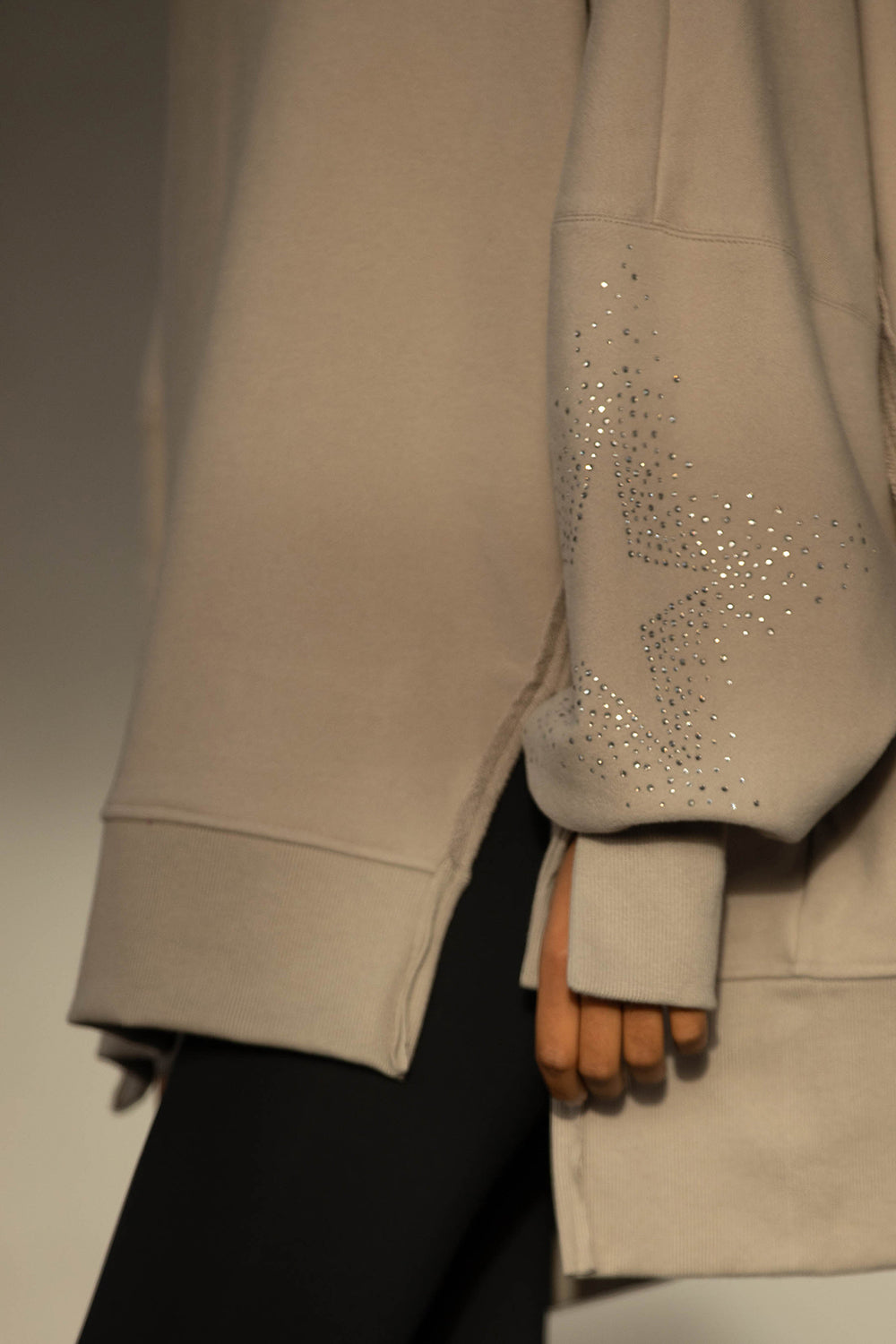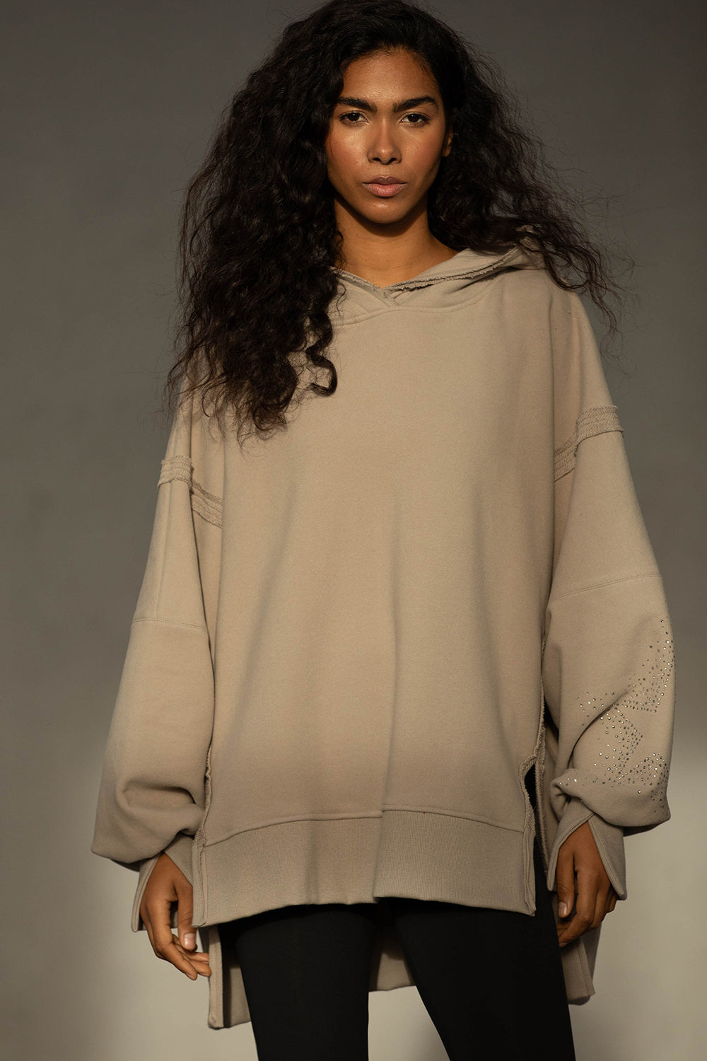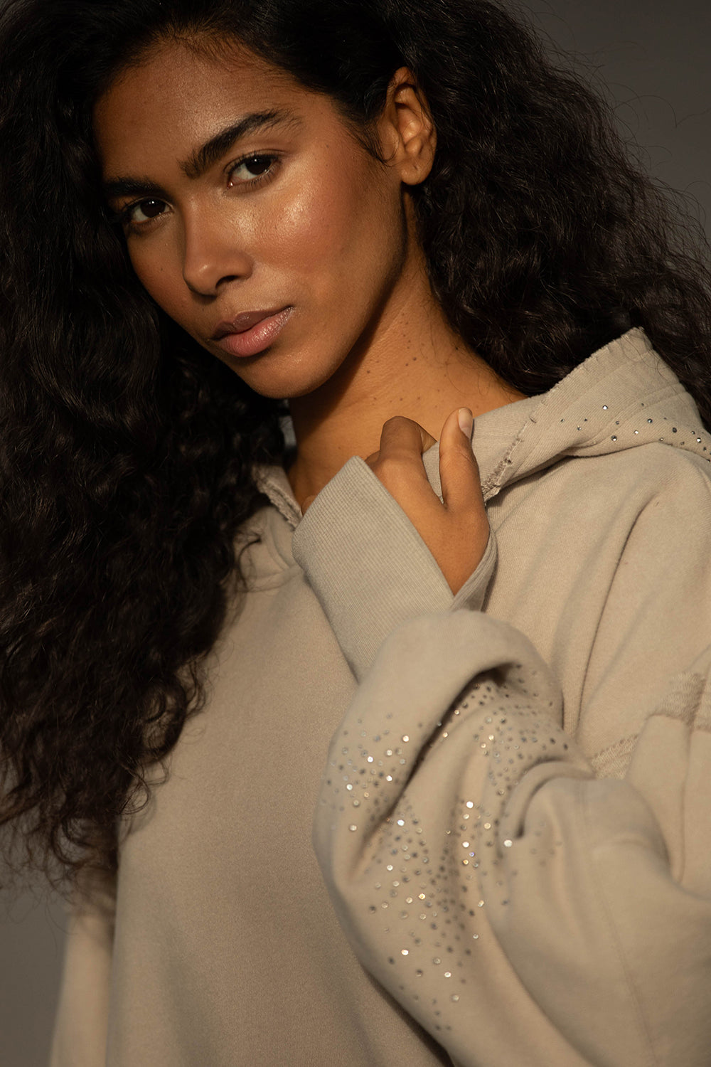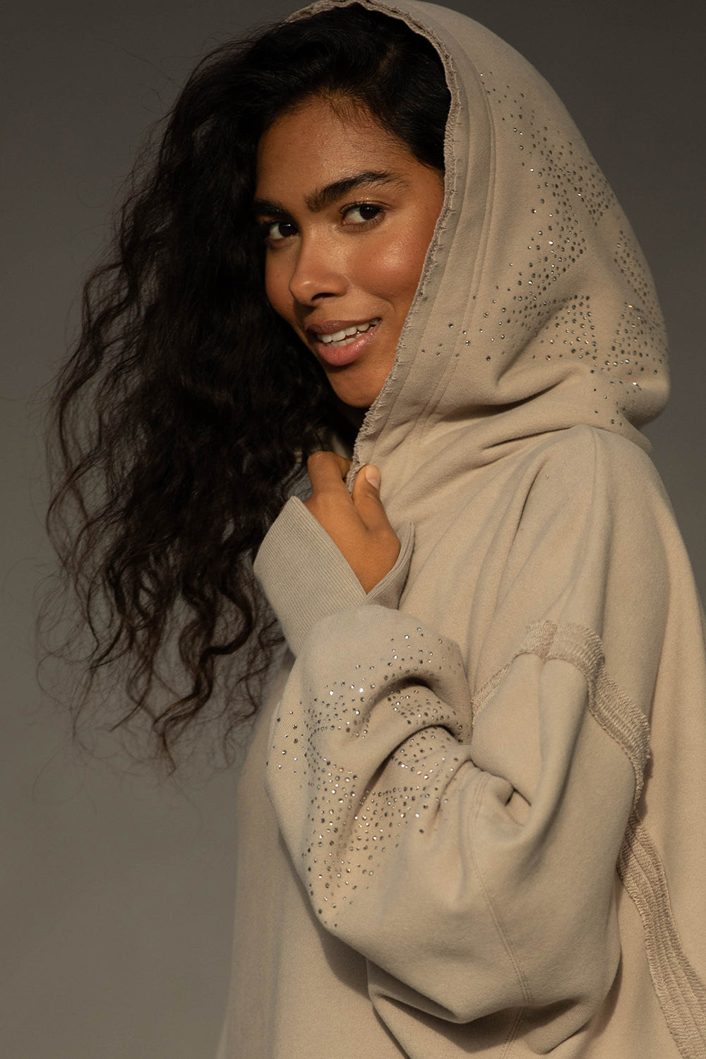 Oversize, charakter I wygoda wszystko w jednym. Ta bluza to styl w czystej formie. Surowy, lekko postrzępiony brzeg przy kapturze nadaje jej charakteru, to celowy zabieg konstrukcyjny, który sprawia, że kaptur wygląda bardziej „żywo”, mniej grzecznie, bardziej streetowa. Na rękawach i przy bokach znajdziesz ozdobne przeszycia, które przełamują gładkość dzianiny i dodają formie surowej architektury. Nie jest to zwykła bluza, to projekt ze świadomie odsłoniętymi elementami konstrukcji. Duży i obszerny, miękko opadający kaptur, surowo wycięta krawędź daje mu mocny, streetwearowy vibe, a gwiazdy jedna na rękawie i druga na kapturze wykonane z kryształków robią niesamowity efekt, kryształki dobieramy pod kolor dzianiny, aby stworzyć monochromatyczny efekt. Mocny oversize z wydłużonym tyłem, szerokimi rękawami i obniżoną linią ramion. Surowa, miejska, nowoczesna.
