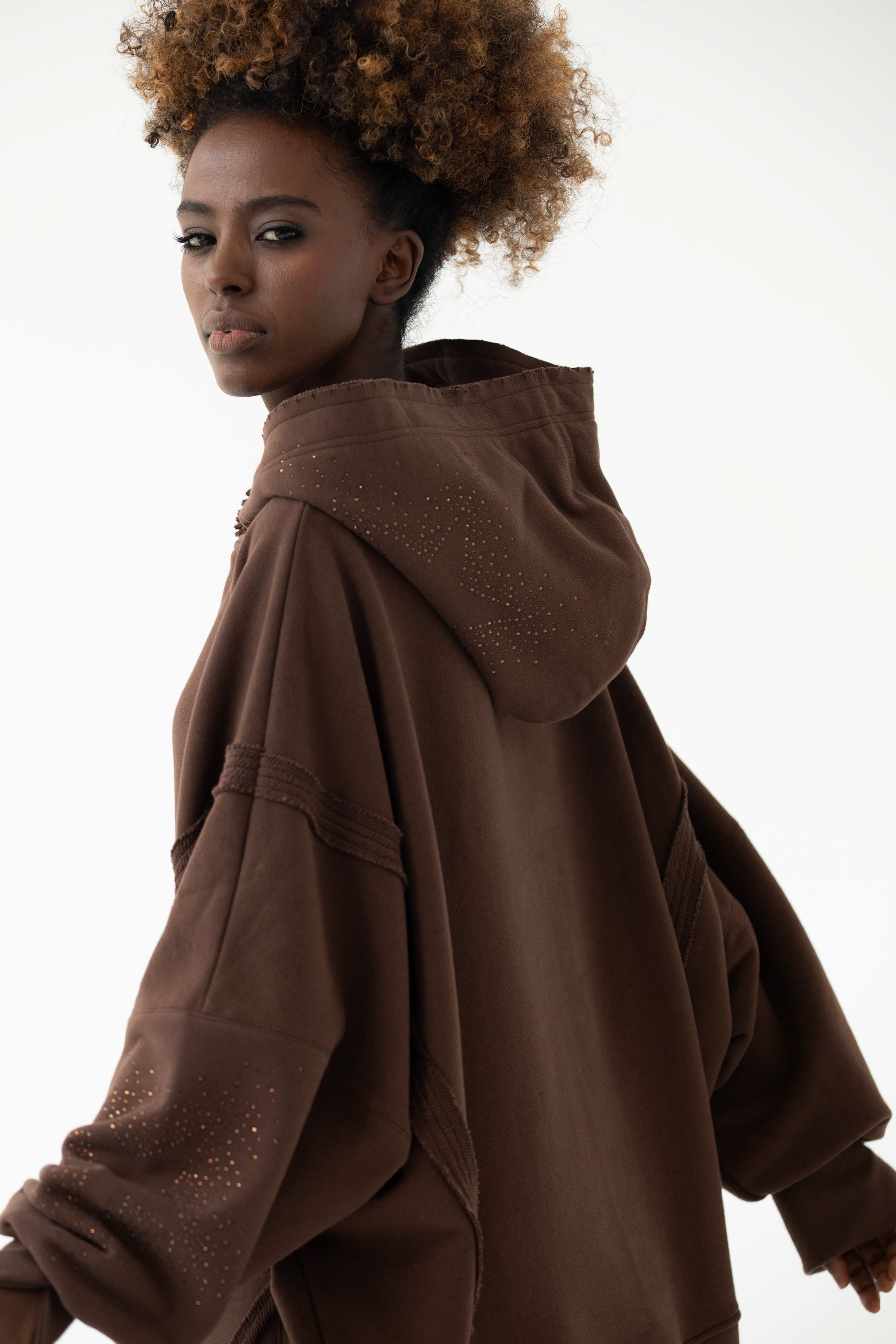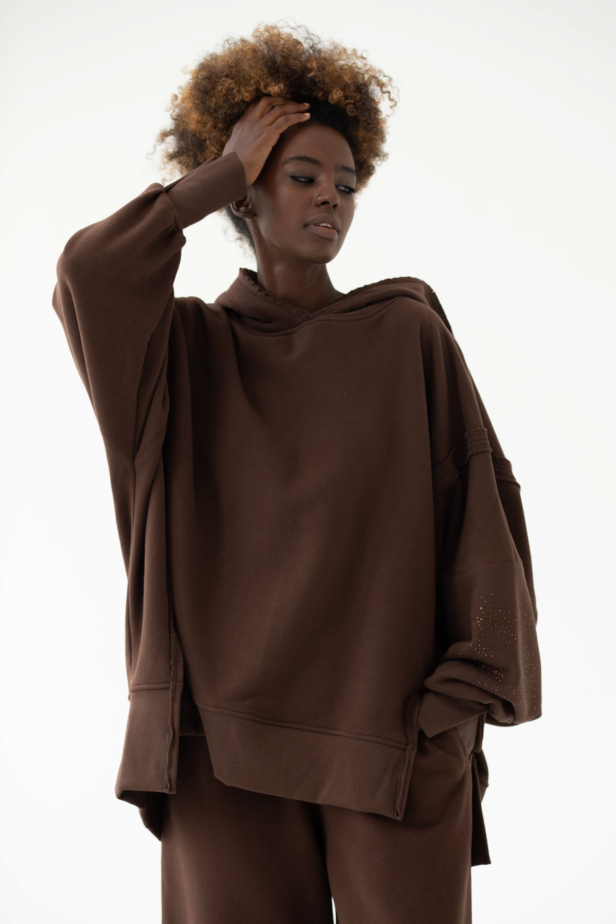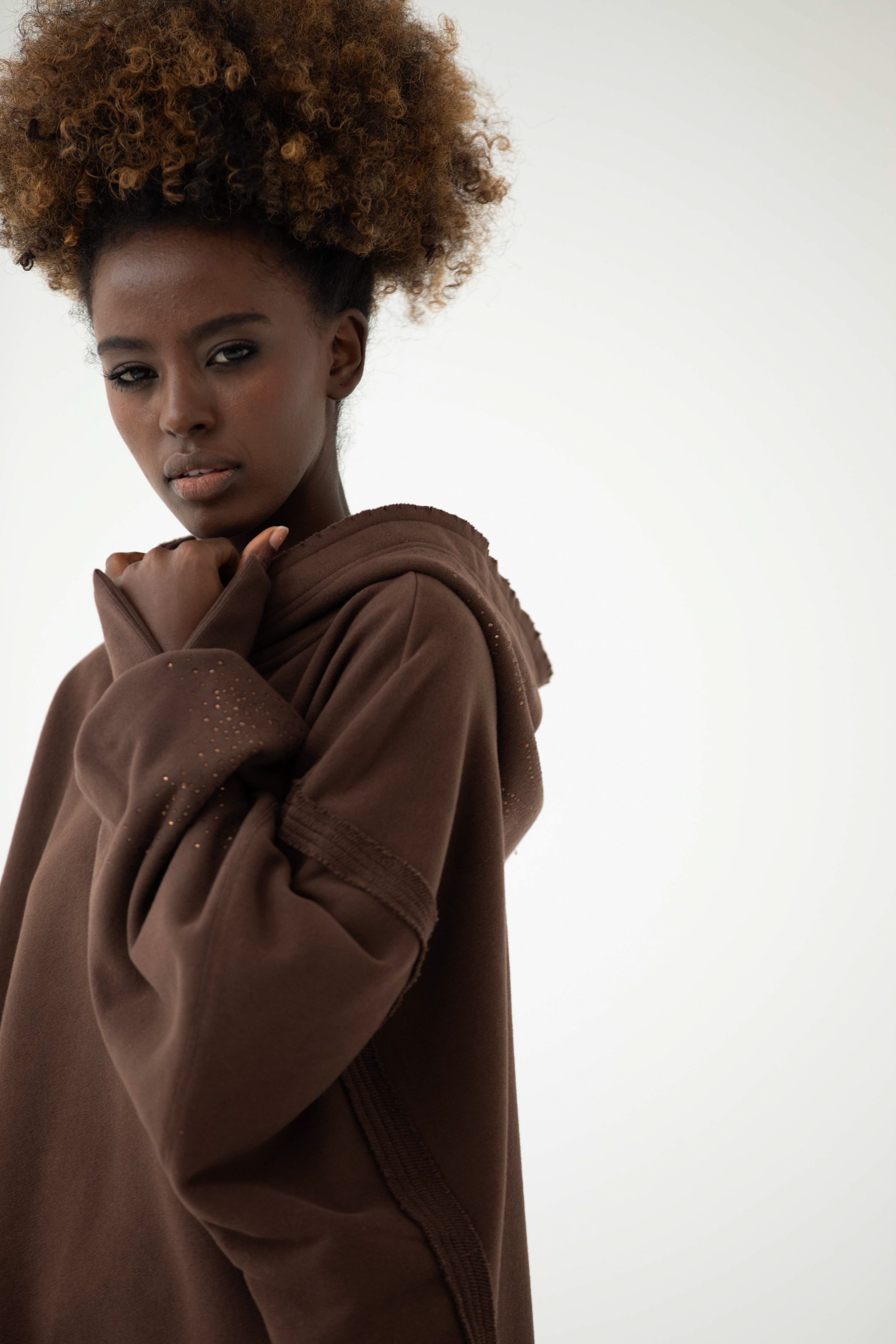 Ever to nasz flagowy model z charakterystycznymi przeszyciami, pęknięciami na rękawach oraz "pociętym" kapturem, który zaczyna wyglądać jeszcze lepiej z każdym kolejnym praniem. EVER allstars została uszyta z mięsistej dzianiny pętelkowej diagonal, gramatura 320 g, dodatkowo z uszlachetnieniem skin peach i ponownym zmiękczaniem w dotyku przypomina delikatną skórkę brzoskwini. Oprócz tego, że jest mięsista to również niesamowicie miękka i przyjemna dla skóry. Fason oversize, bardzo wygodna i charakterystyczna forma z wydłużonym tyłem. Aplikacja na kapturze i rękawie, dwie duże gwiazdy wykonane z czarnych błyszczących kryształków. Legenda głosi, że nasza EVER uzależnia i na jednej się nie kończy :) Świetnie wygląda w połączeniu z czarnymi leginsami jeansami.