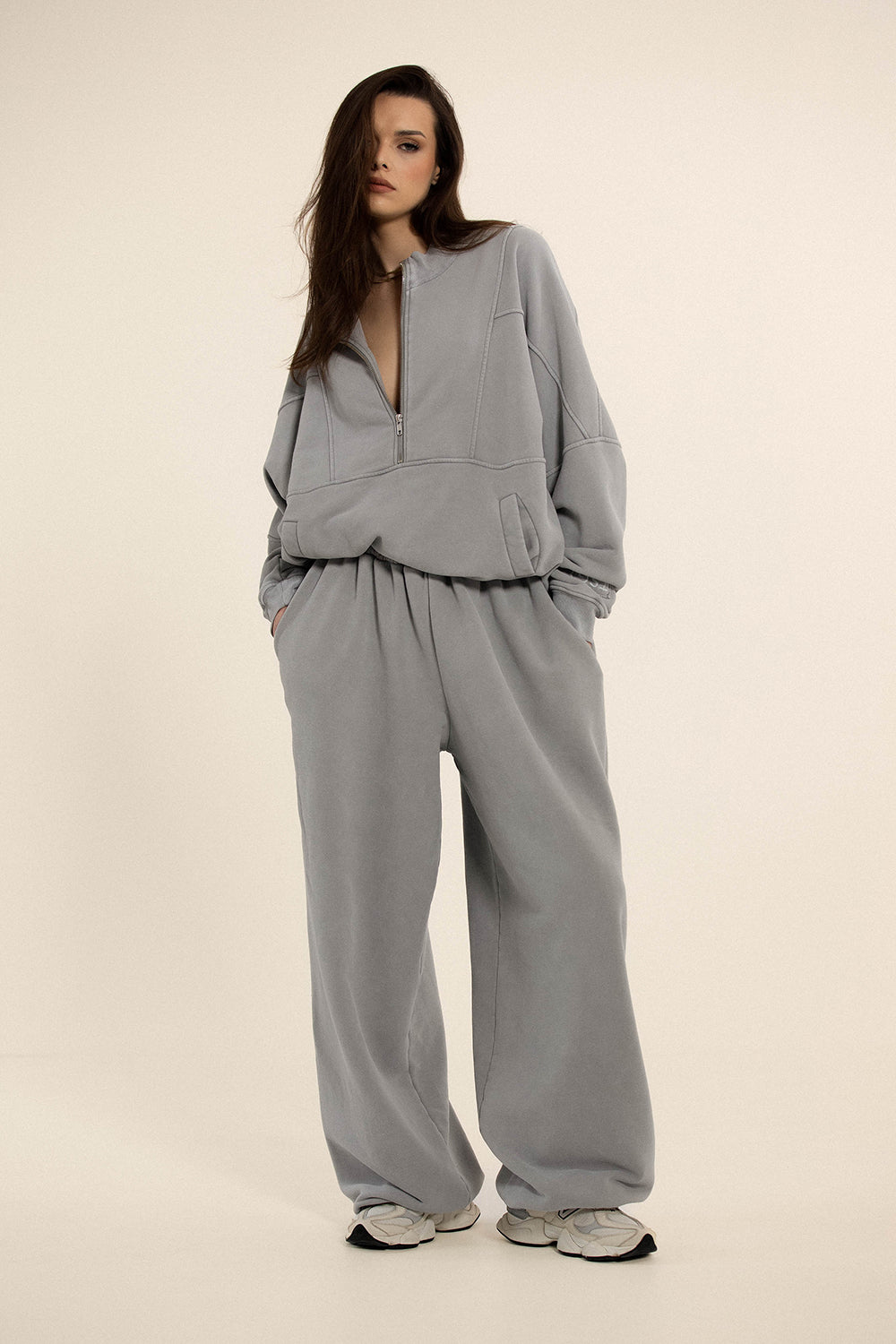 Rozpięty zamek, dekolt wybłyszczony drobinkami, spacer.. czujesz ten klimat? Dokładnie.. o to chodzi! Kieszenie, charakterystyczne przeszycia i oversizowa forma świetnie sprawdzi się w stylizacjach casualowych i streetwearowych. Dodatkowe pranie nadaje jej charakterystyczny efekt vintage. Bluza Half Zip to baza szafy, do której będziesz chętnie wracać przez lata.