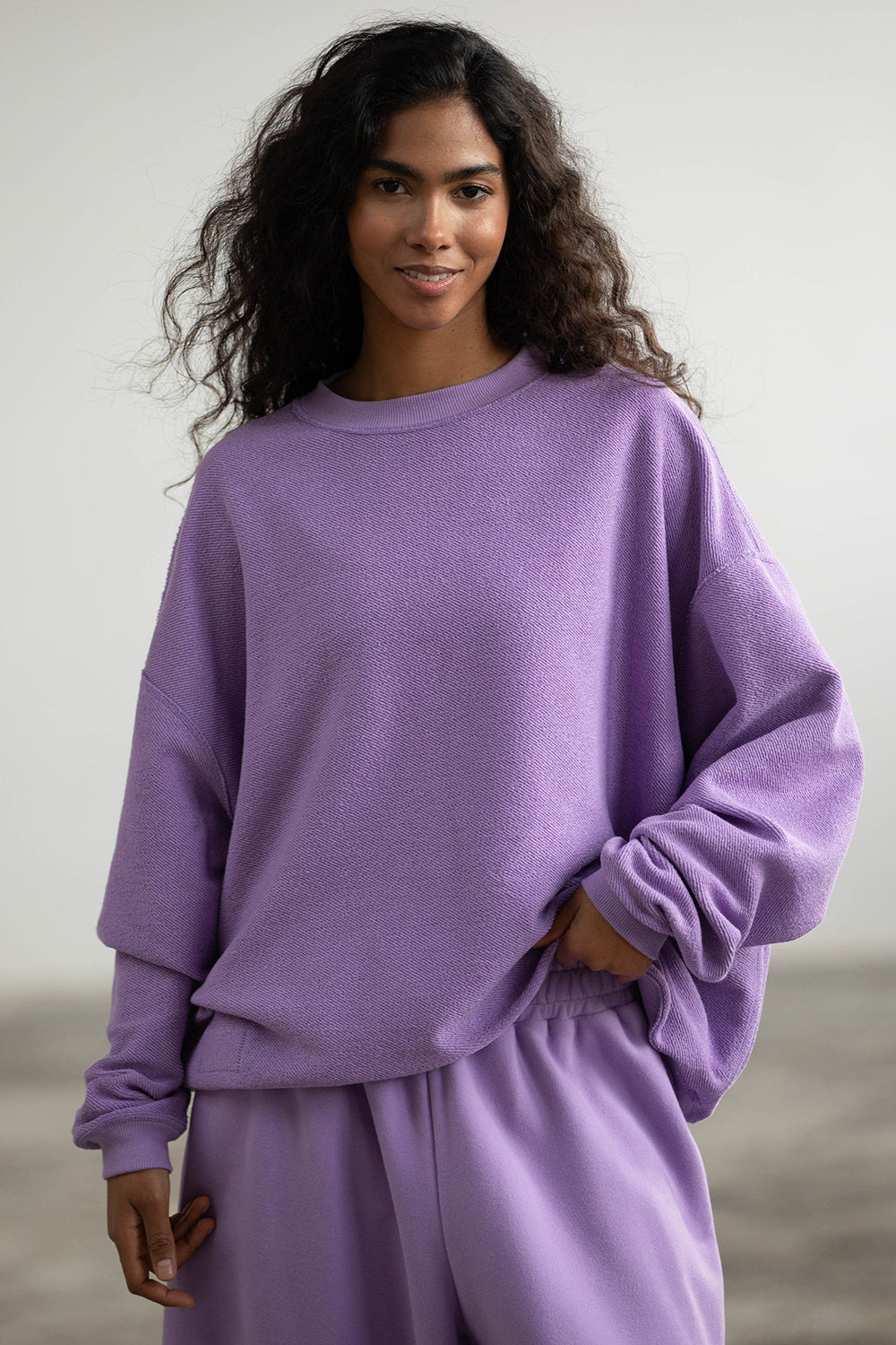 Dwustronna, ultramiękka i totalnie unikatowa. Uszyliśmy bluzę Reverse tak, żeby można było nosić ją na dwie strony. Od wewnątrz dzianina ma piękną, wyrazistą strukturę diagonalnej pętelki i uznaliśmy, że szkoda ją chować dlatego wszystkie szwy zostały zszyte na płasko, estetycznie i równo, żeby po odwróceniu bluza wyglądała tak samo dobrze jak na prawej stronie. Oversize z opadającą linią ramion miękko układa się na sylwetce i daje pełną swobodę ruchu. Idealny balans między streetwearowym luzem a szlachetną prostotą. Nowoczesna, charakterystyczna i komfortowa, ta bluza to ten model, który nosisz non stop i na dwa sposoby, bo oba wyglądają świetnie.