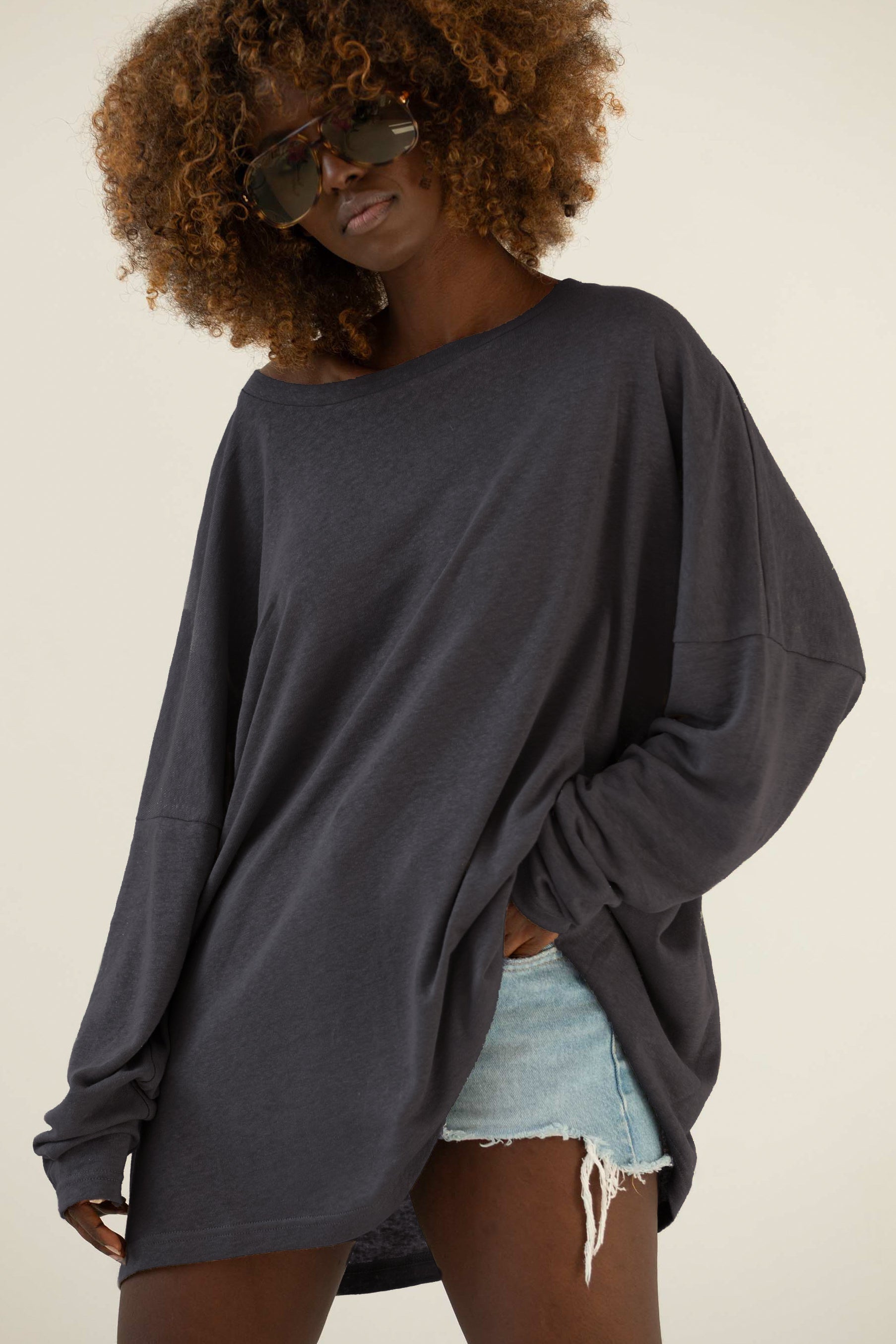 Miękki, przewiewny, totalnie lekki. Tego longsleeve’a praktycznie nie czuć na skórze. Oversize’owy krój sprawia, że układa się dokładnie tak, jak chcesz, nonszalancko luźno lub delikatnie opadając na jedno ramię. Uniwersalny, wygodny, ale z charakterem czyli taki, do którego będziesz wracać.
