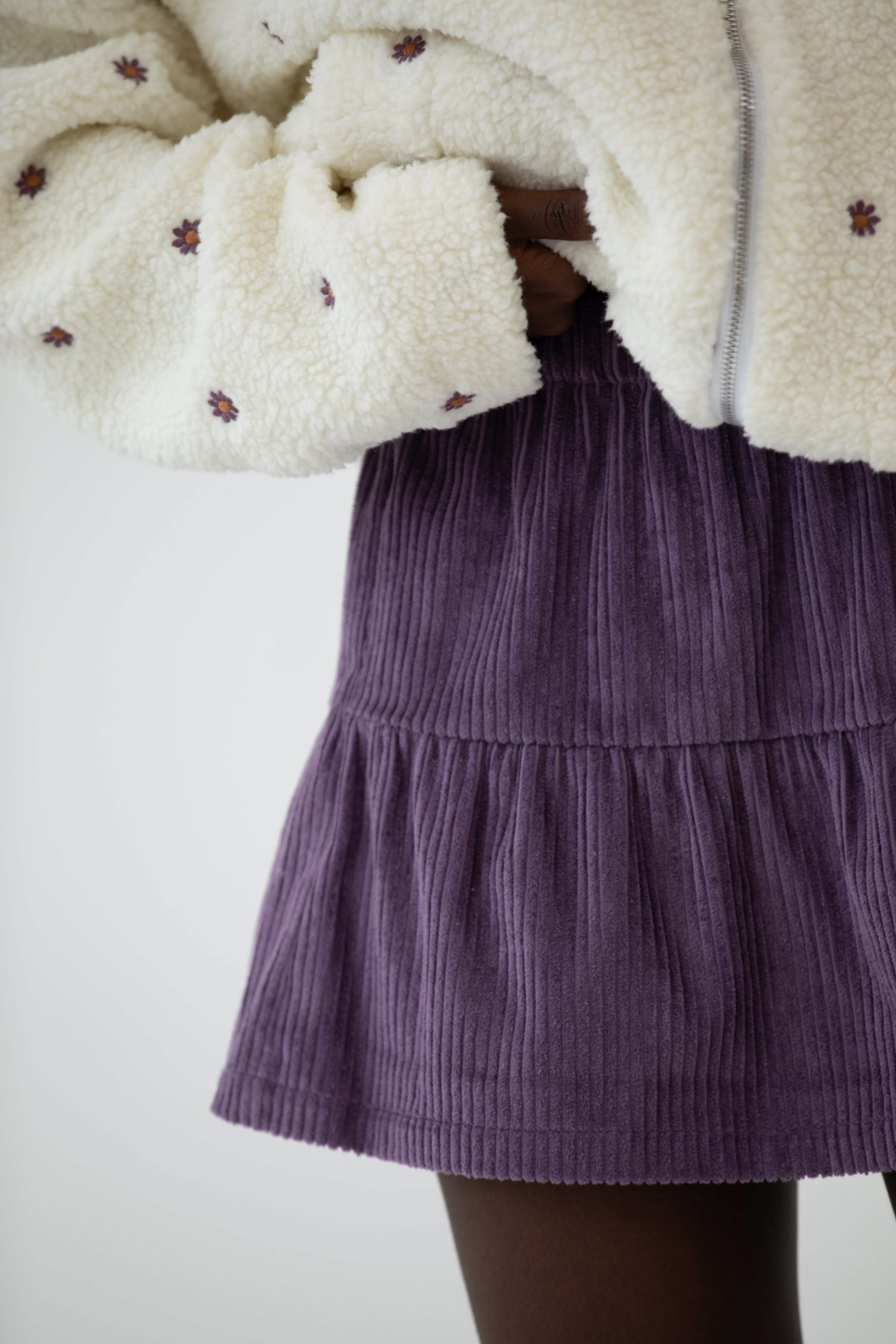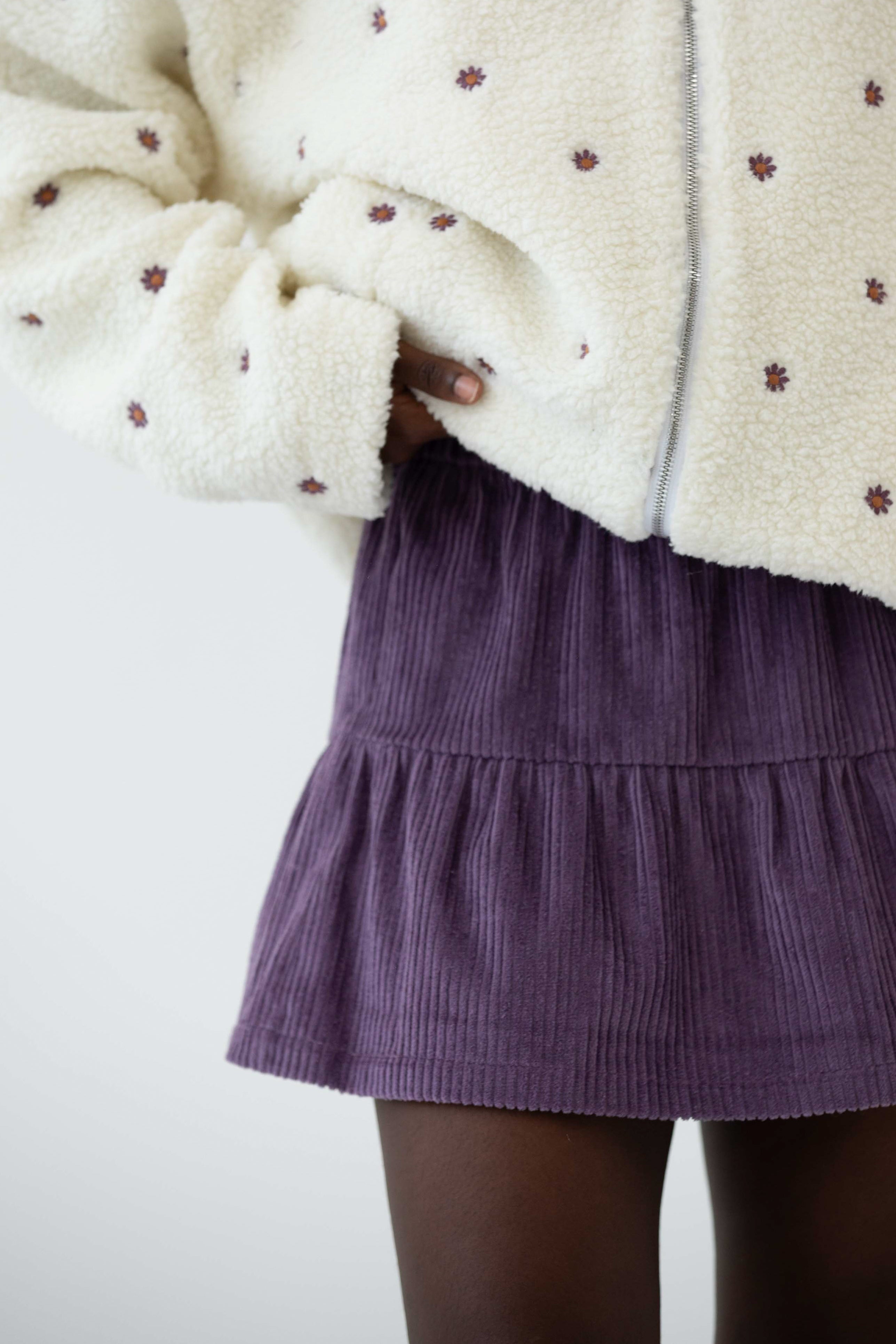 Fioletowa sztruksowa mini w klimacie retro. Ma delikatnie rozkloszowany dół i elastyczną talię, więc nosi się ją totalnie bez wysiłku, zakładasz i wyglądasz. Idealna na co dzień, ale z odpowiednimi dodatkami ogarnie też bardziej fancy look. To taki element garderoby, który nie potrzebuje wiele, wystarczy prosty top, oversize bluza albo sweter, a całość od razu nabiera charakteru.