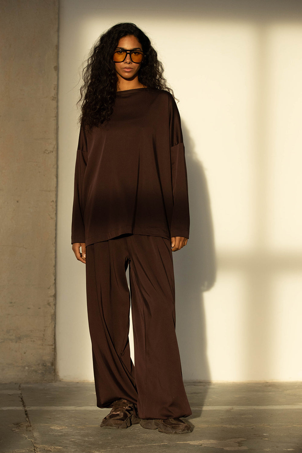 Spodnie Touch miękkie i lejące. Elegancki połysk i głęboki odcień czekolady tworzą look, który płynie w ruchu. A to wszystko w tkaninie stworzonej specjalnie po to, by jesień i zima były nie tylko stylowe, ale przede wszystkim… przyjemne. Lyocell w składzie świetnie oddycha, odprowadza wilgoć i jest jedwabiście gładki. Zimą daje uczucie naturalnego ciepła, a jednocześnie pozwala skórze oddychać i nie przegrzewa natomiast wiskoza dodaje miękkości i pięknego, luksusowego opadania materiału. W chłodniejsze dni zapewnia przytulność, ale bez ciężkości. Elastan sprawia, że spodnie płyną z każdym ruchem. Efekt? Materiał, który nosi się jak miękka mgiełka, ale otula jak ulubiony sweter. Luźne, mocno lejące, z naturalnym połyskiem, który pracuje z ciałem i podkreśla nowoczesny charakter. To typ wide leg, który nie udaje, że jest trochę szeroki on po prostu jest szeroki. Elegancki, minimalistyczny i totalnie na czasie. Idealne do miejskiego slow looku, codziennych i wieczornych minimalistycznych stylizacji.