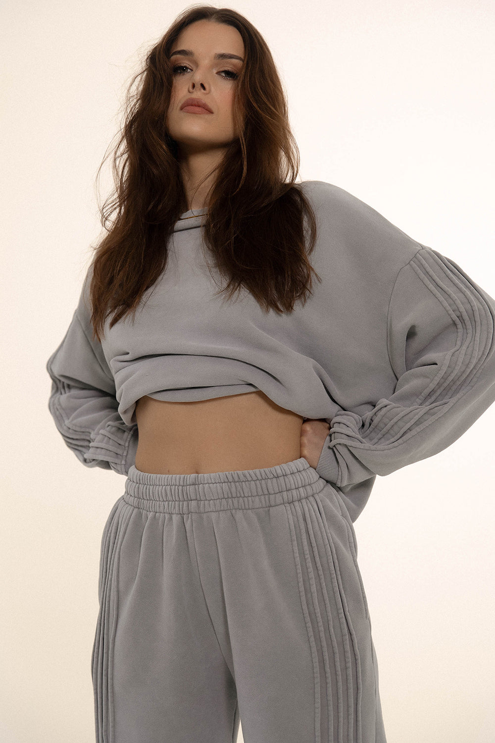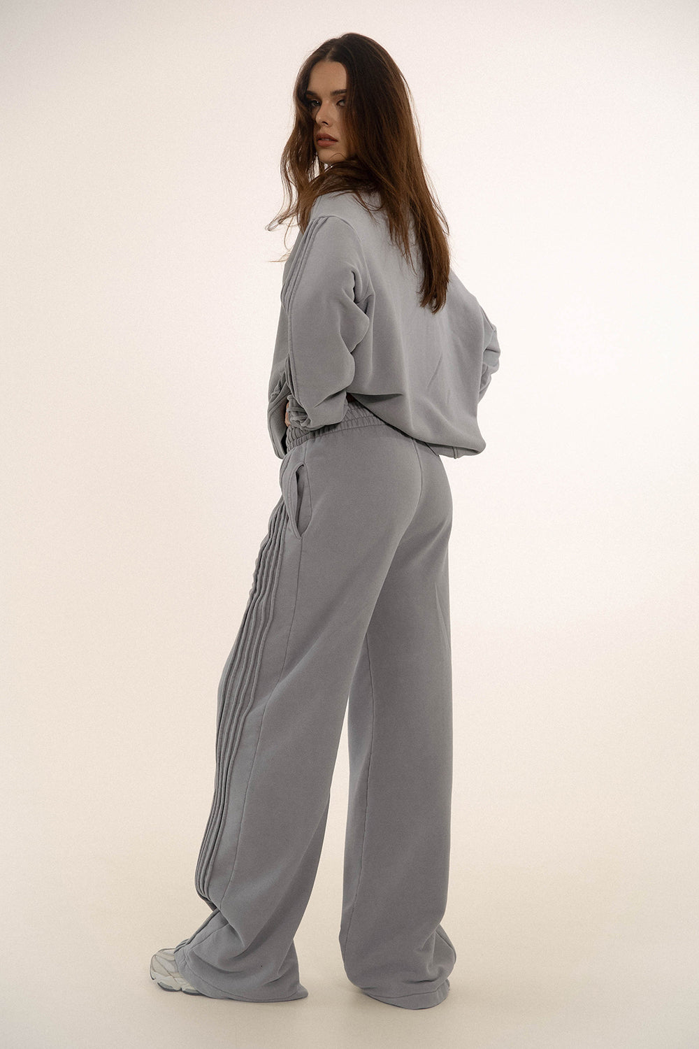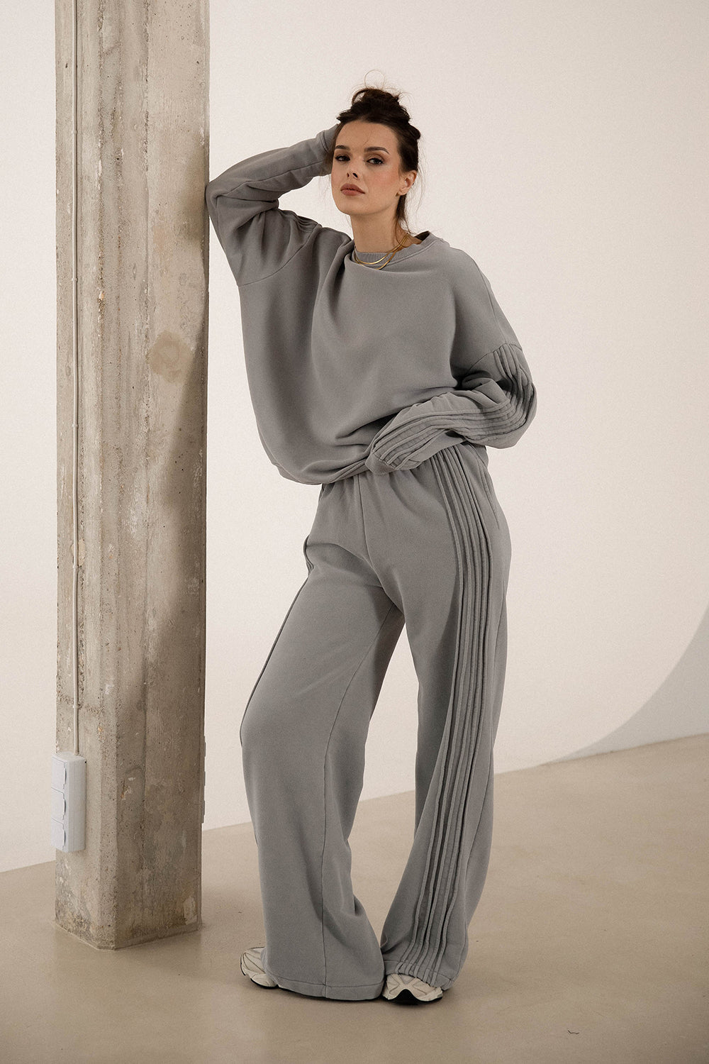 Spodnie z szeroką nogawką i charakterystycznymi przeszyciami. Bardzo wygodna, szeroka guma w pasie z sznurkami, którymi możesz regulować szerokość. Dodatkowe pranie nadaje charakterystyczny efekt vintage.