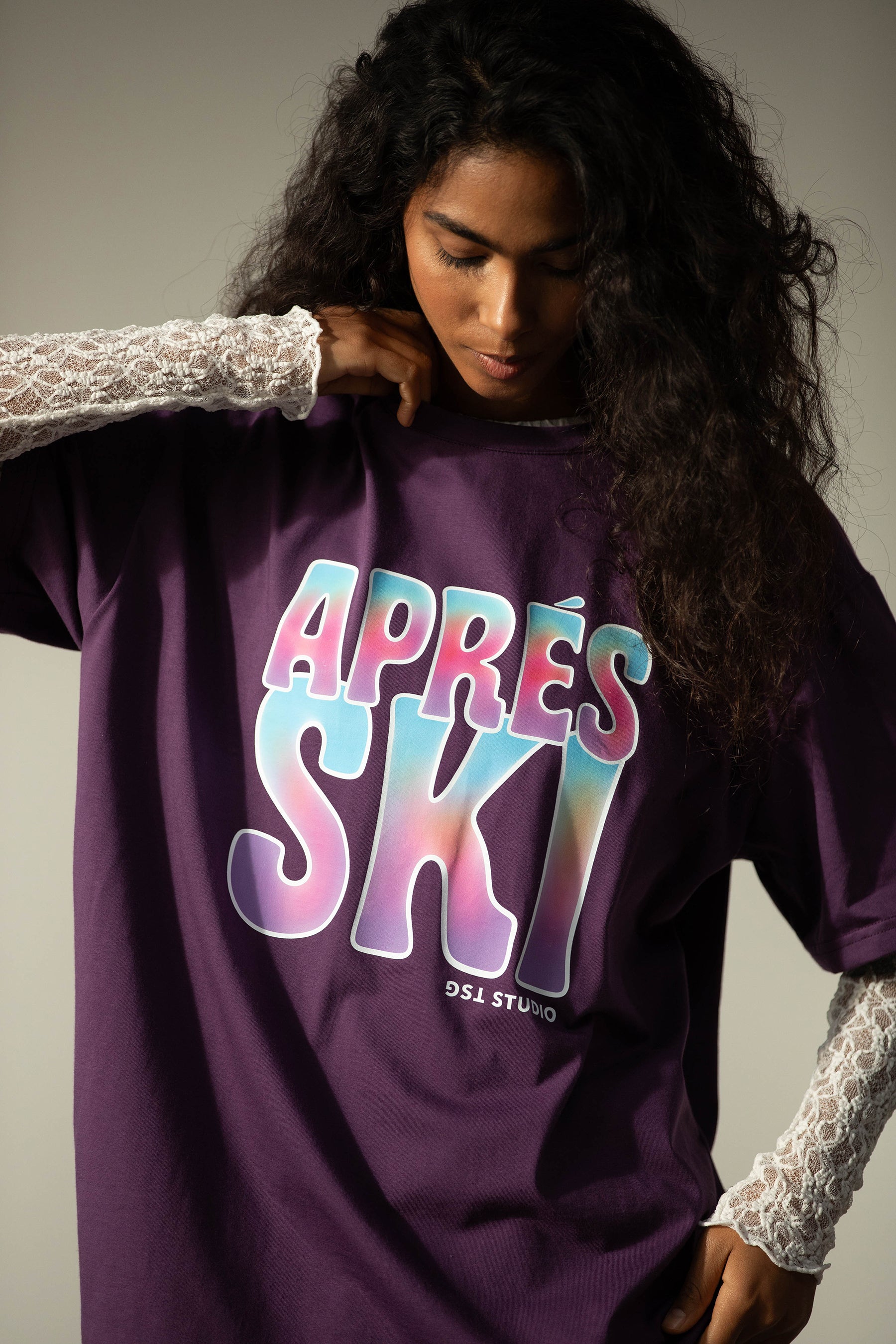Zimowa energia w najmodniejszym wydaniu. Soczysty odcień śliwkowego fioletu i kolorowy, gradientowy print APRÈS SKI na froncie sprawiają, że ten model przyciąga spojrzenia, ale nadal pozostaje w naszym ukochanym, oversize’owym luzie.